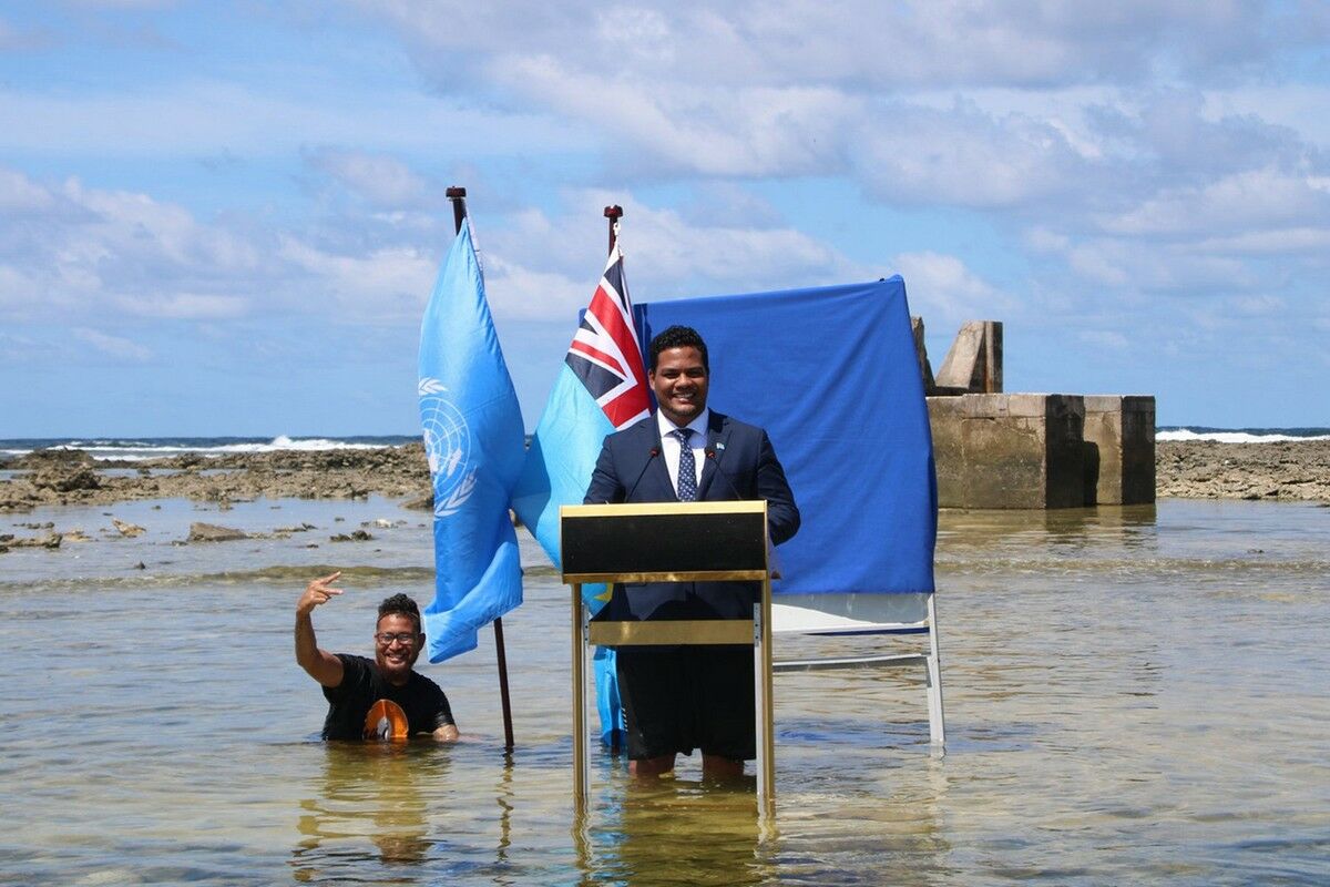В рамках климатического саммита ООН министр юстиции, коммуникаций и иностранных дел островного государства Тувалу Саймон КОФЕ обратился к ООН в видеоформате, находясь по колено в воде.