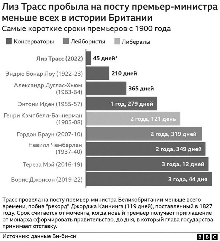 А сама Лиз Трасс заявила, что в течение недели консерваторы проведут выборы своего нового лидера. Отметим, она находилась у власти всего 45 дней, это самый короткий в новейшей истории срок пребывания на посту британского премьер-министра Великобритании до его заявления о своей отставке. До нее премьер-министром с самым коротким сроком службы был Джордж КАННИНГ, который прослужил на этом посту 119 дней до своей смерти в 1827 году.