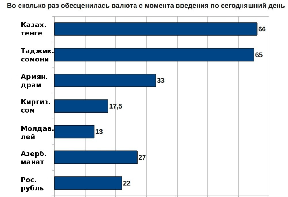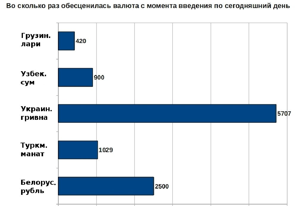 Через три дня после выхода Украины из советской рублевой зоны ее примеру последовал наш ближайший сосед - Узбекистан. За 1 советский рубль давали 1 сум-купон. К сожалению, нам не удалось раздобыть данные о стоимости доллара в Узбекистане на момент выхода из рублевой зоны. Самые старые архивные данные - лишь после июля 1994 года, когда Узбекистан ввел свою нынешнюю валюту - сумы. Обмен сумов-купонов на сумы осуществлялся по курсу 1000 к 1. Тогда один доллар США стоил в Узбекистане 6 сумов. В конце 1994-го доллар подорожал до 25 сумов. В 2000-м он уже стоил 326 сумов, в 2010-м - 1640. Сегодня официальный курс равен 2706,59 сума за доллар. Реальный же курс доллара на черном рынке Узбекистана сегодня оценивается в 4250-4500 сумов. По оценкам экономистов, за прошедший после своего введения 21 год официальный курс сума упал почти в 500 (!) раз, на черном рынке сум обесценился в 900 раз! По словам узбекских экономистов, которых цитирует радио “Озодлик”, причиной обесценивания узбекского сума является не денежно-кредитная политика, а безуспешность экономической политики Узбекистана.