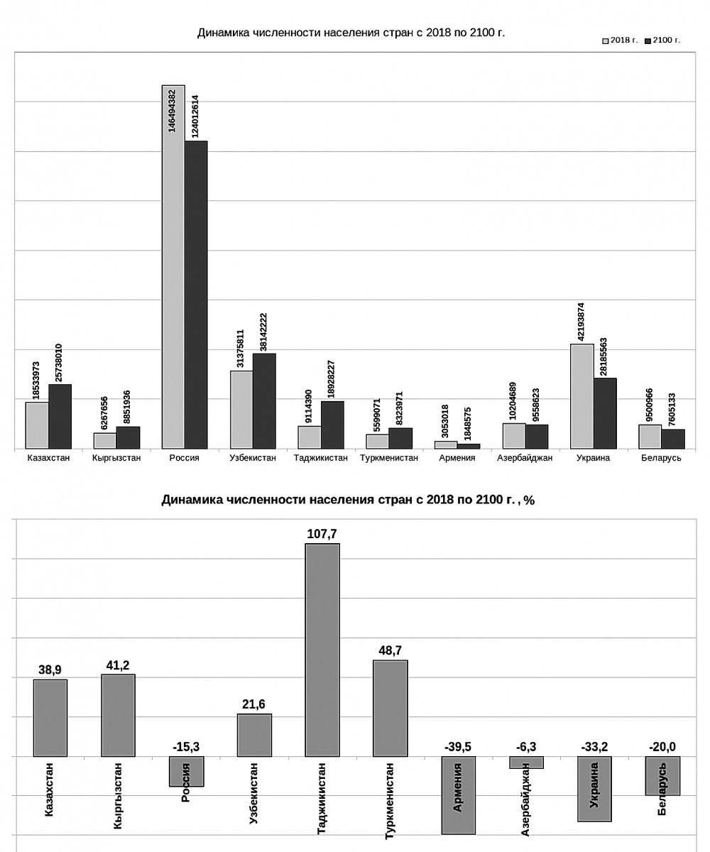 На сегодняшний день многие эксперты бьют тревогу из-за отрицательного сальдо миграции, мол, из страны выезжает больше людей, чем въезжает. Но это ситуация на текущий момент, а если рассматривать в перспективе, то, судя по прогнозам ООН, количество желающих перебраться в Казахстан на ПМЖ будет неуклонно расти. Такой вывод можно сделать, анализируя общую динамику численности населения Казахстана с 2018 по 2100 год (см. диаграмму). Как видите, Казахстан, равно как и другие центральноазиатские республики (Кыргызстан, Таджикистан, Узбекистан и Туркменистан), сможет похвастать к 2100 году положительной динамикой, в то время как Россия, Украина, Беларусь, Армения и Азербайджан, наоборот, завершат столетие с отрицательной динамикой.