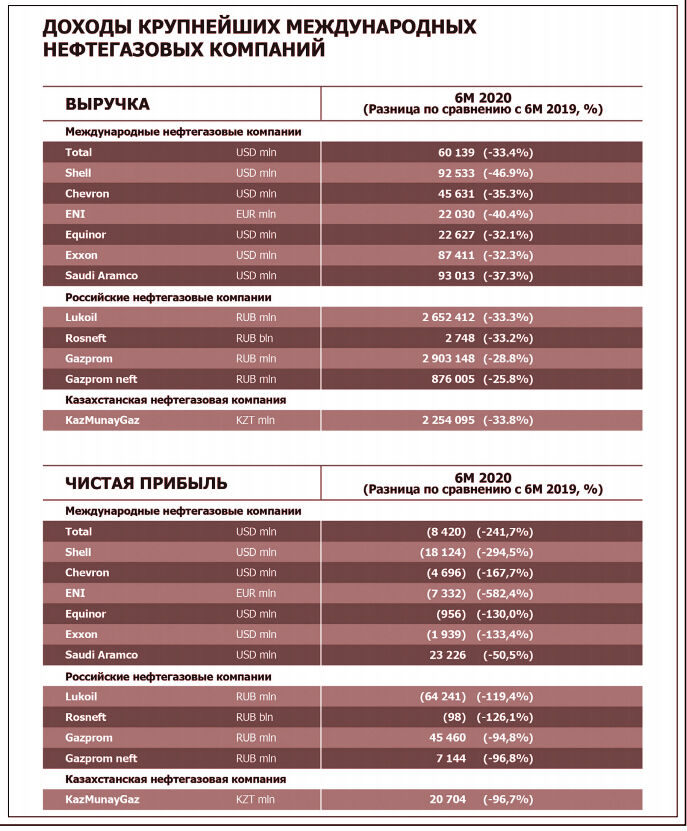 А вот по графе “чистая прибыль” минусы у компаний разнятся значительно. Самая большая разница за сравниваемые периоды у компании ENI - 582,4%. Следом идет Shell, у которой чистая прибыль за шесть месяцев 2020 года упала на 294,5%. Нефтегазовый оператор Казахстана “КазМунайГаз” в относительно “хорошем” положении: его чистая прибыль за шесть месяцев 2020 года по сравнению с первым полугодием 2019 года снизилась на 96,7%. Лучше, чем у КМГ, ситуация только у двух компаний: Saudi Aramco (- 50,5%) и “Газпром” (- 94,8%). Конечно, не стоит забывать, что и сравниваемые цифры у компаний значительно отличаются.