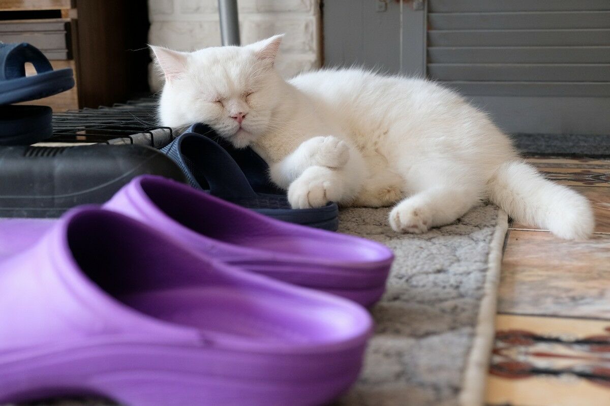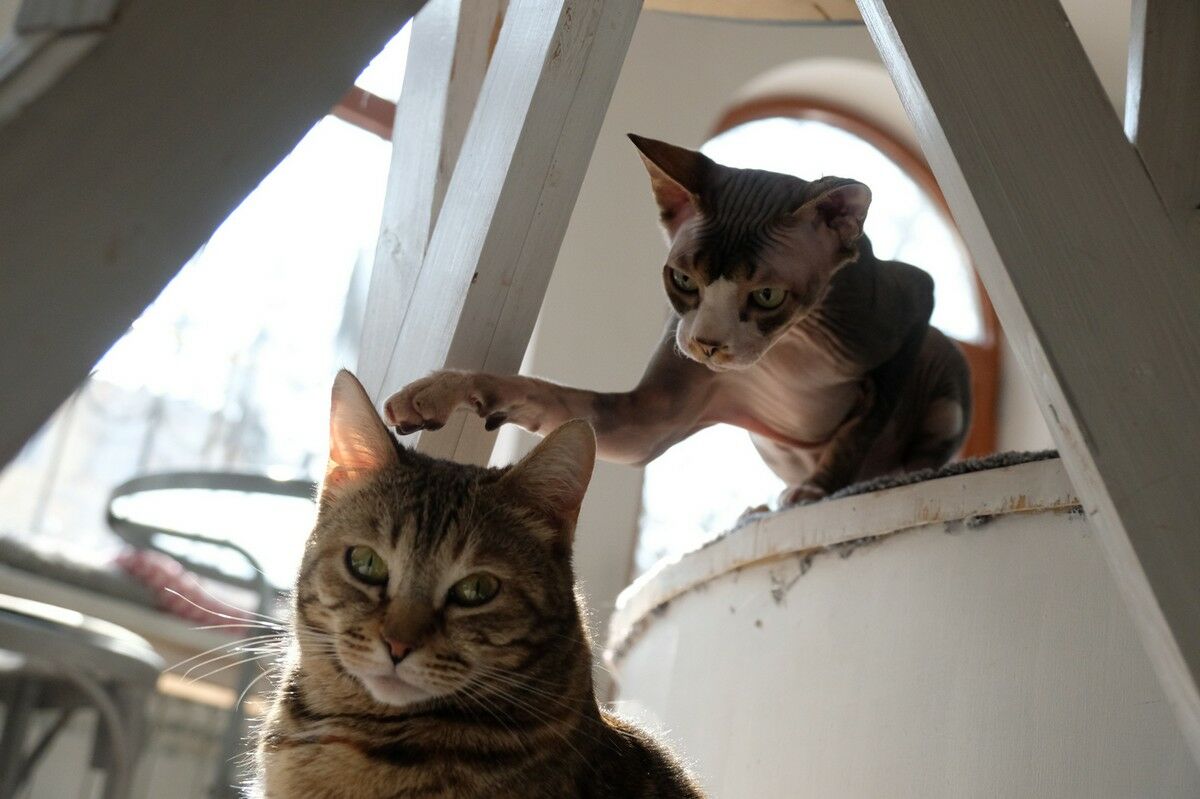 Единственный строгий запрет для котиков в этом заведении - нельзя лазать на барную стойку, где готовят кофе и раскладывают по тарелочкам угощение для гостей. Санитарные нормы превыше всего. В зале же посетители сами отвечают за сохранность своих бутербродов. Впрочем, коты, сбившись в стаю, не хулиганят, наоборот, следят за порядком. Белоснежный Малыш контролирует выдачу тапок и наблюдает за правильностью приготовления кофе. Винки, серый сфинкс, создает движняк, чтобы посетителям было интересно - он задирает друзей, пытается расшевелить умиротворенных коллег. Рыжая Джулия - специалист по фотосессиям, она даже позволяет примерить на себя шапочку. О таких безобразиях, чтобы порвать гостям колготки или поцарапать их, речи нет.