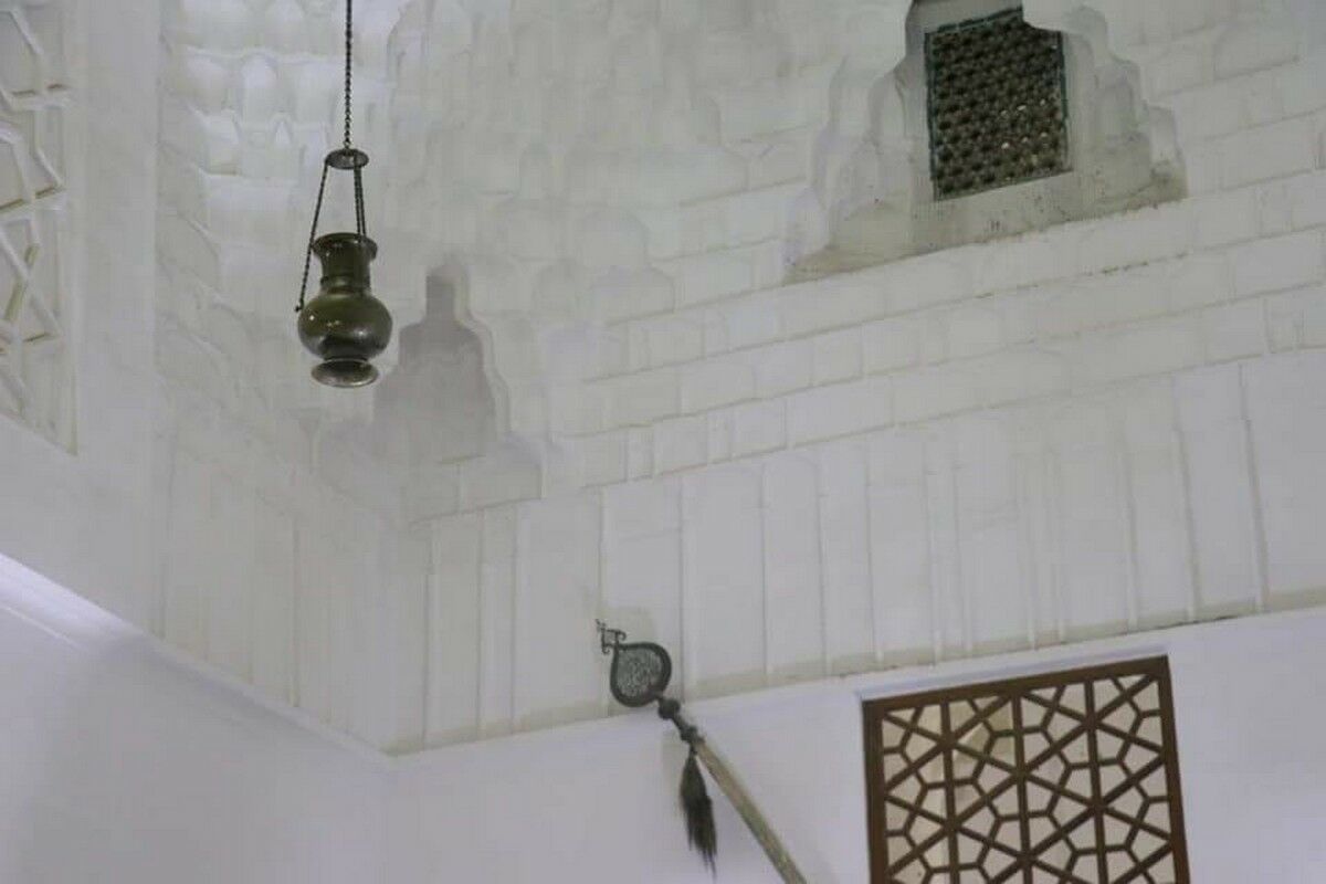 Светильник имеет форму кувшина. По бокам в трех местах закреплены цепи для подвешивания, крючок выполнен в виде барсов, которые также изображены на молоточке двери Казандыка. От времени светильник потемнел, но сбоку можно прочитать надпись на персидском языке. В переводе она гласит: “Великий из султанов, свидетельство справедливости, Ходжа Ахмет Ясави. Этот подвесной светильник шыракшы Хажжаж ибн Уаккас Сайрами передал в дар мавзолею Султана (имеется в виду Ходжи Ахмета Ясави. - К. Е.) в качестве уакфа”. Уакф в мусульманском праве - это передача предмета в безвозмездное пользование. Теперь же очищенный светильник занял свое историческое место.