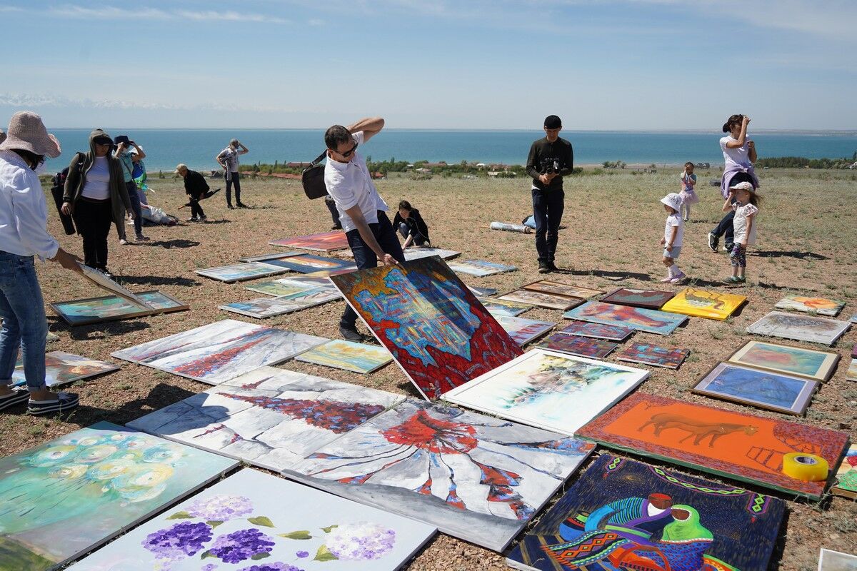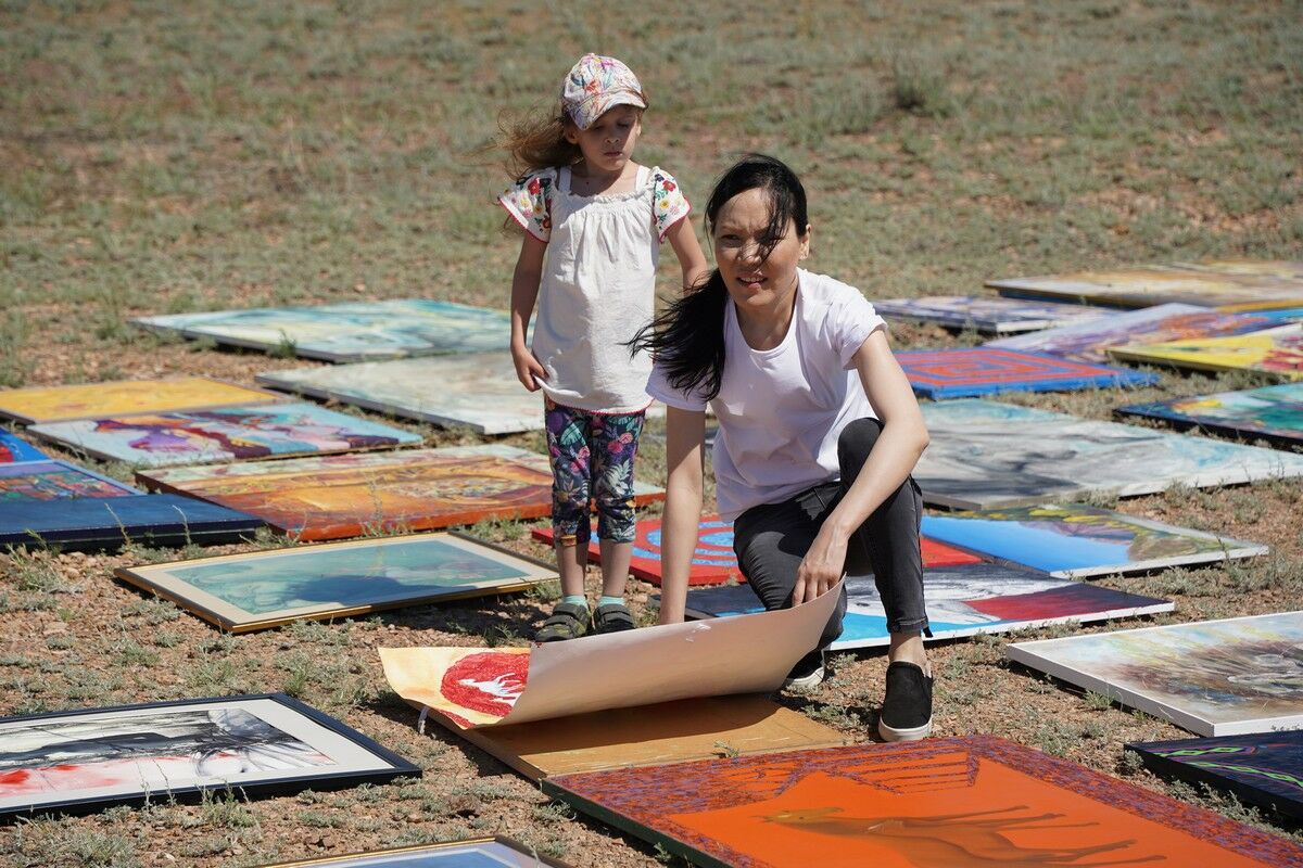 Алматинские художницы устроили вернисаж в степи. Мужчинам доверили только запускать дрон и наблюдать происходящее со стороны.