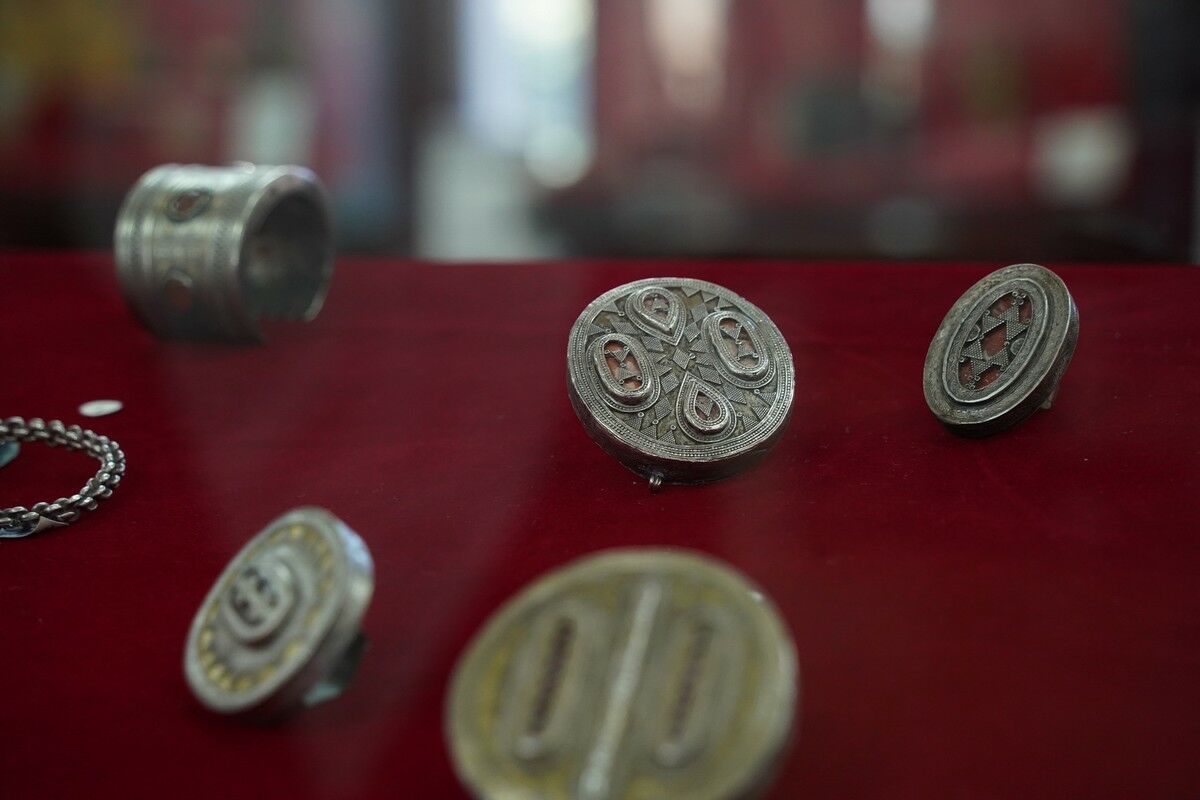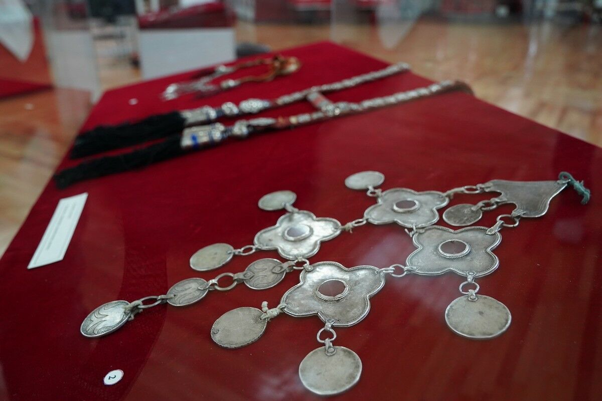 Собрание небольшое, но великолепно подано. Кимешеки надеты на модели женских голов, стоят без витрин, без ограждений. Фоном экспозиции служит серия старых черно-белых фотографий, на которых можно увидеть разнообразие и типажи ткани, покрывающей волосы. И дополнено все это небольшим количеством серебряных украшений, которые тоже традиционно носили жительницы степи. Каждый экспонат, как попал в фонды музея, снабжен детальным описанием и историей.