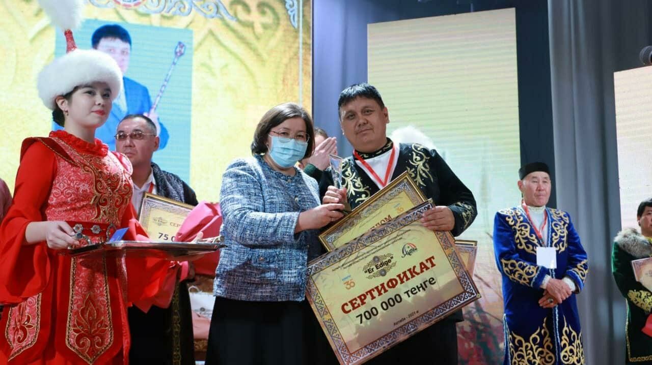 Специальный приз “Ер Едіге” и 350 тысяч тенге вручили Аманкелди САНКИБАЕВУ из Мангистауской области. Приз акима Актюбинской области - 150 тысяч тенге - получил Абдуррахман ЕСТАЙУЛЫ из Нур-Султана, победа в номинации “Молодой жыршы” и премия в 150 тысяч тенге досталась актюбинцу Гани КАЙРОЛЛАЕВУ.