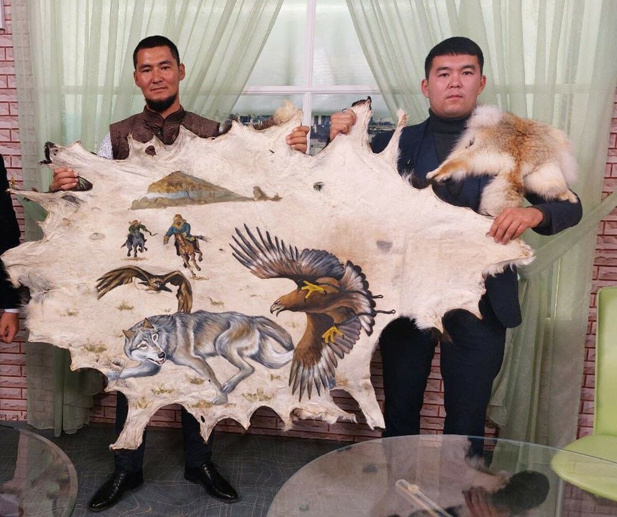 Художник Жасулан Егеубай отвечает за эстетику конечного продукта. Первое творение двух мастеров было создано на овечьей шкуре. Художник написал этюд охоты с ловчими птицами. Совместный труд занял около недели.