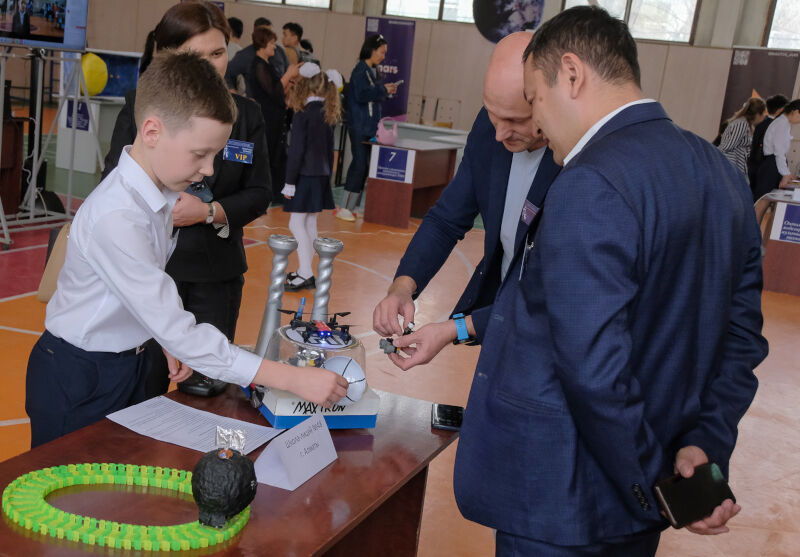 Конкурс, стартовавший около трех месяцев назад, преследовал главную цель - найти талантливую молодежь, еще со школьной скамьи задать ребятам нужную траекторию развития и в будущем получить поколение инженеров, математиков и специалистов IT с горящими глазами. В финал вышли 92 проектные команды. Ученик четвертого класса алматинской школы-лицея №48 Максим ВОДОПЬЯНОВ демонстрирует зрителям свою модель марсохода новейшего образца. Его проект Maxtron победил в младшей категории. Разработчик предусмотрел мощную защиту от радиации, а также снабдил марсоход легкой броней и лазерной пушкой - на случай, если между исследователями Марса из разных стран вспыхнет конфликт. Но у лазера есть и вполне мирное назначение - убирать препятствия с пути космических исследователей.