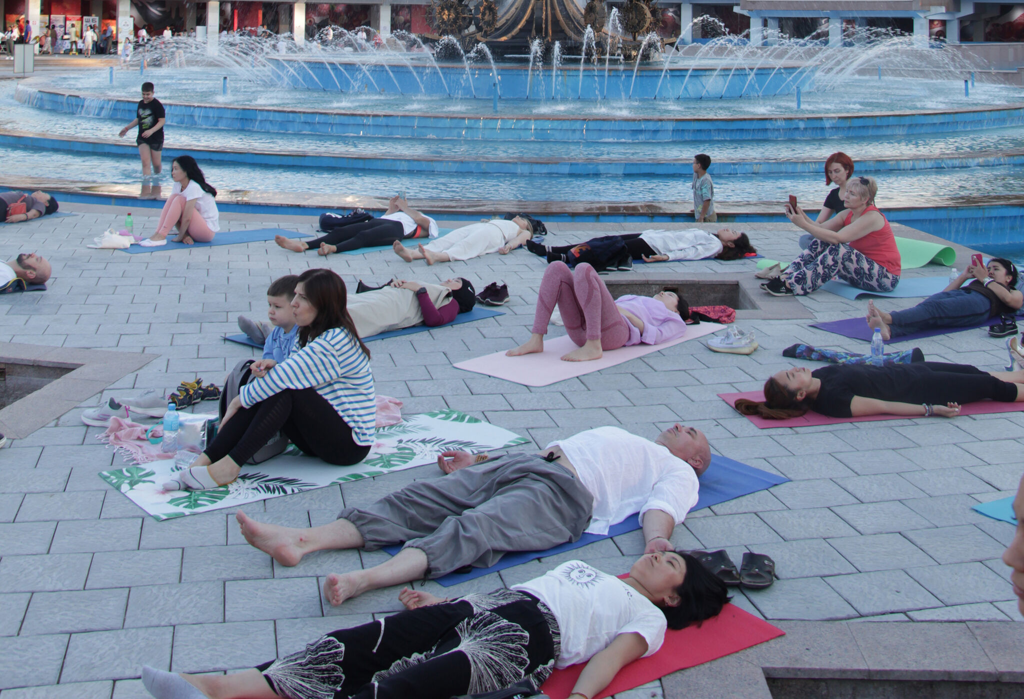 В этот день все желающие могли прийти в парк и заниматься йогой в большой и дружной компании. С четырех часов дня группы начали свои занятия на открытом воздухе. Руководители центров активно вербовали новичков, приглашая приходить в их студии. Между асанами можно было попробовать настоящие индийские угощения, купить ароматические палочки, амулеты, постоять на гвоздях. Объединила всех участников практическая медитация под гонг. Хотя со стороны непосвященным казалось, что люди просто лежат на ковриках, на самом деле участники, как батарейки, вырабатывали личное и общее спокойствие.