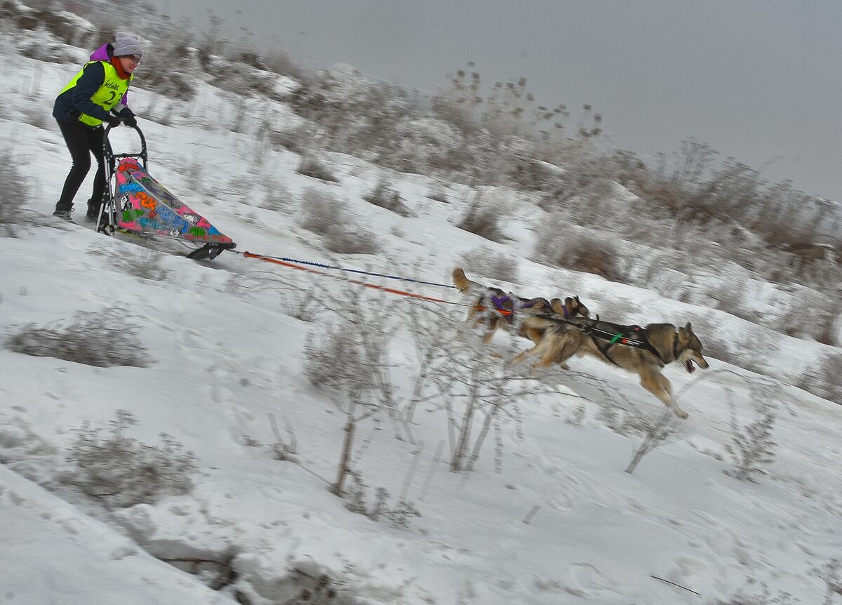 Особенно эффектно старты смотрятся, когда в упряжку запрягают сразу несколько собак. Задние ряды называют колесами - они тянут упряжку, те, кто впереди, задают темп. Управляет четверкой собак Екатерина ЖГУТА, сегодня она соревнуется с собой и своим прошлогодним результатом, а еще заочно со спортсменами из других городов Казахстана. Получается республиканский формат. Хороший старт берет Екатерина, но на трассе собаки перемешиваются между собой. Помогать распутаться спортсмену нельзя, сам должен. Тают драгоценные секунды. Выставив поводья правильно, спортсмен на нартах продолжает путь к финишу.