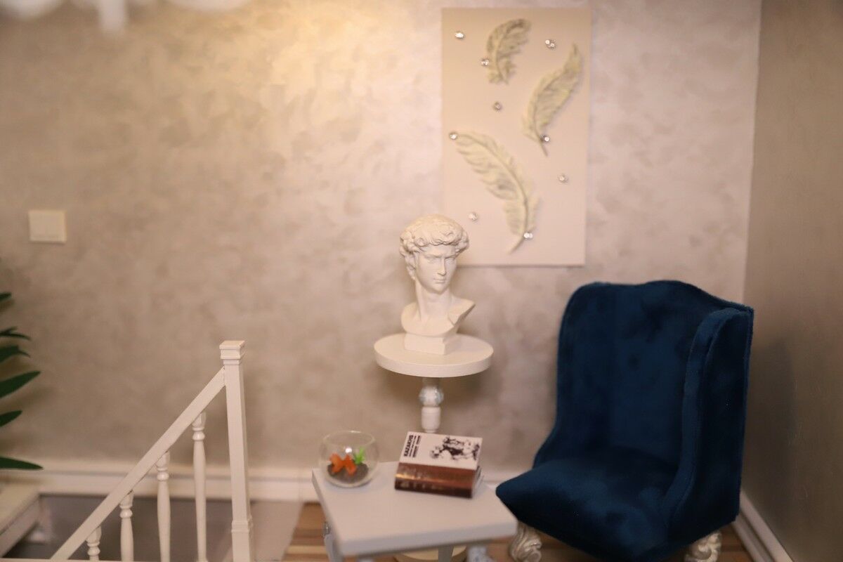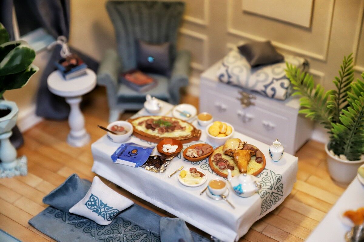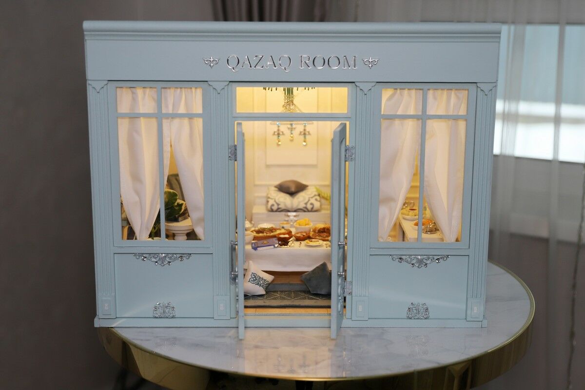 Комнату в казахском стиле Ильсия задумала год назад. Много размышляла, как сделать ее аутентичной, но современной. Получился обеденный нарядный зал - комната, где принимают гостей. И совершенно в духе времени элегантные комоды и диваны, люстры с кристаллами Swarovski, крошечный паркет. Есть даже очень маленькие копии книг - мастер-минималист переснимает и печатает настоящие в миниатюре. Их можно прочесть с лупой или тем, у кого зрение хорошее.