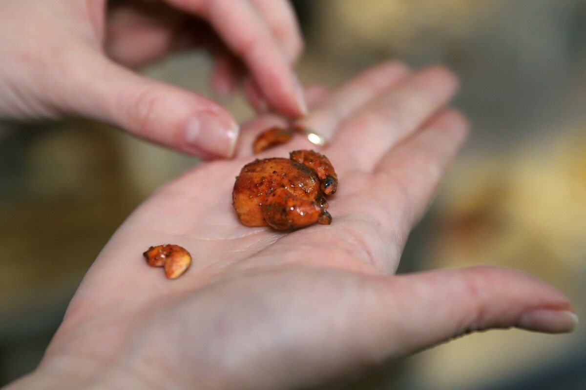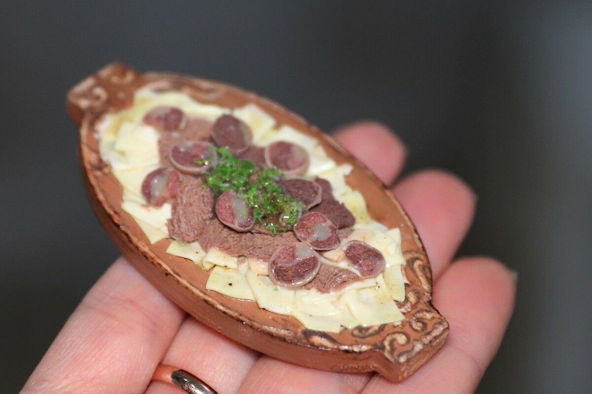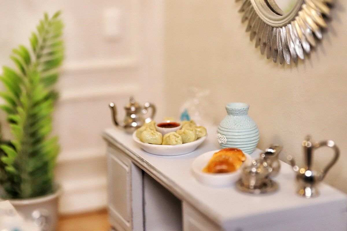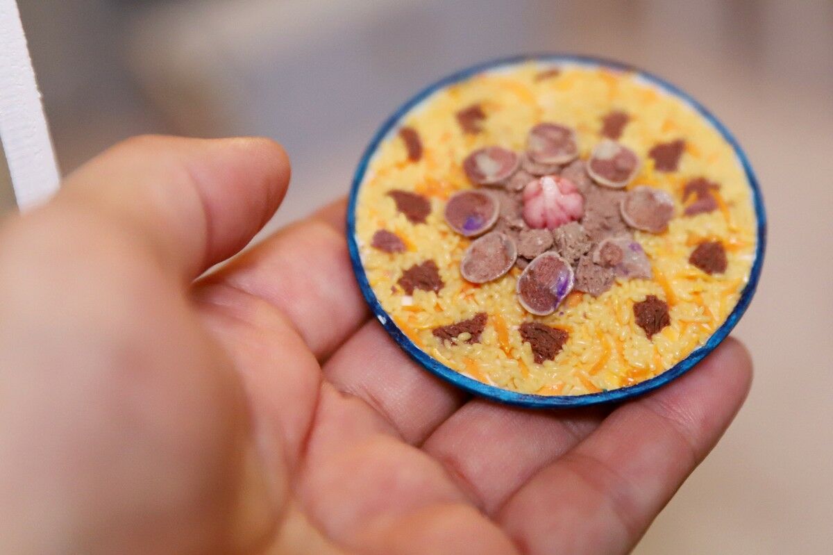 Изготовление несъедобных шедевров отнимает даже больше времени, чем приготовление праздничного обеда у обычной хозяйки. Для крошечных кругляшей курта или астау для подачи бешбармака Ильсия на березовых дощечках вырезала узоры. А чтобы вот так реалистично выглядел миниатюрный беш, сначала запекаются квадраты теста-жайма из полимерной глины (в специальной духовке, иначе в обычной потом готовить будет нельзя) и покрываются лаком. Следующий слой и этап работы - мясо с волокнистой текстурой, заправка из лука. Отдельный восторг - миниатюрные, одна к одной манты, самса. А для того чтобы приготовить рассыпчатый плов, Ильсия слепила 2900 рисинок! Очень красивы пиалы из тоненького фарфора с разлитым по ним чаем.