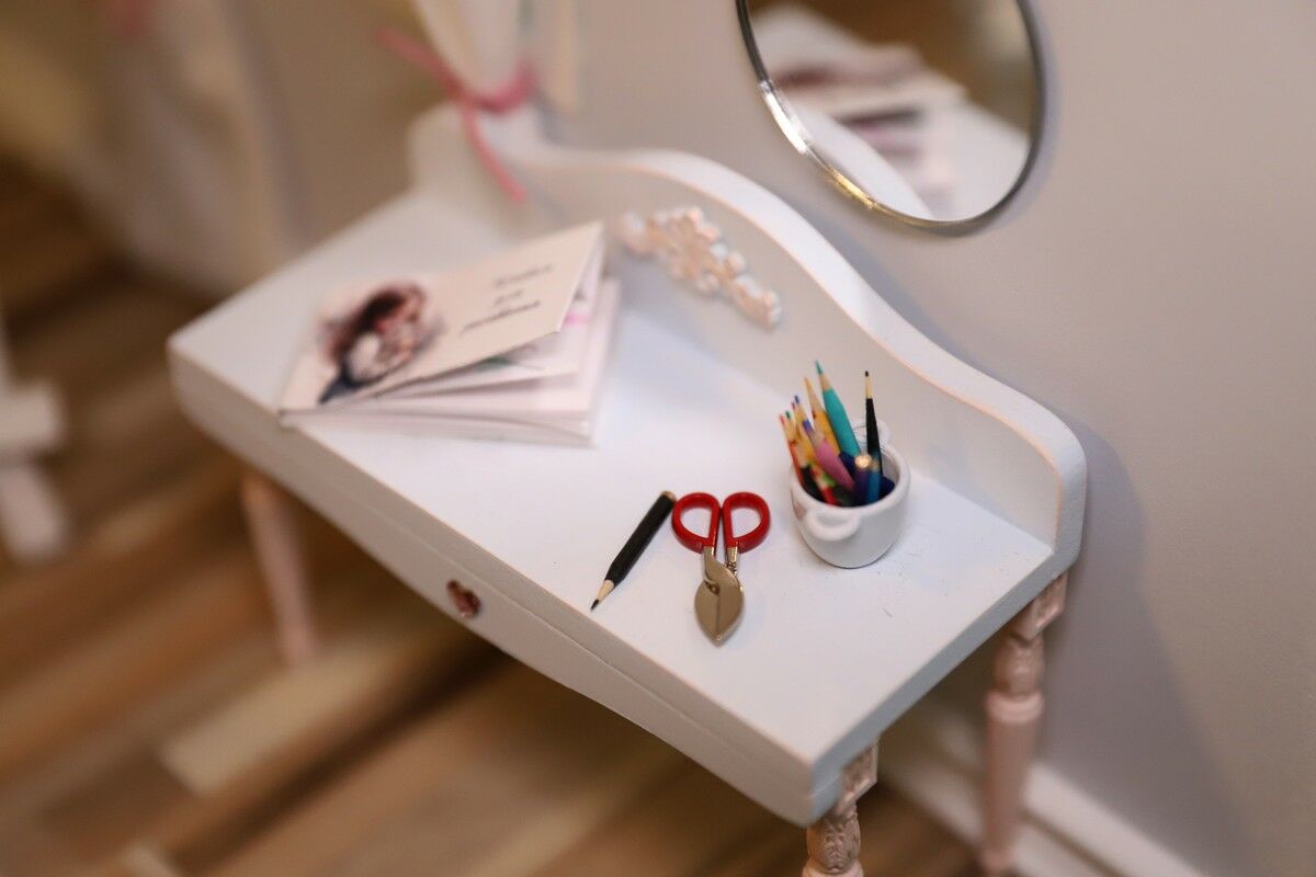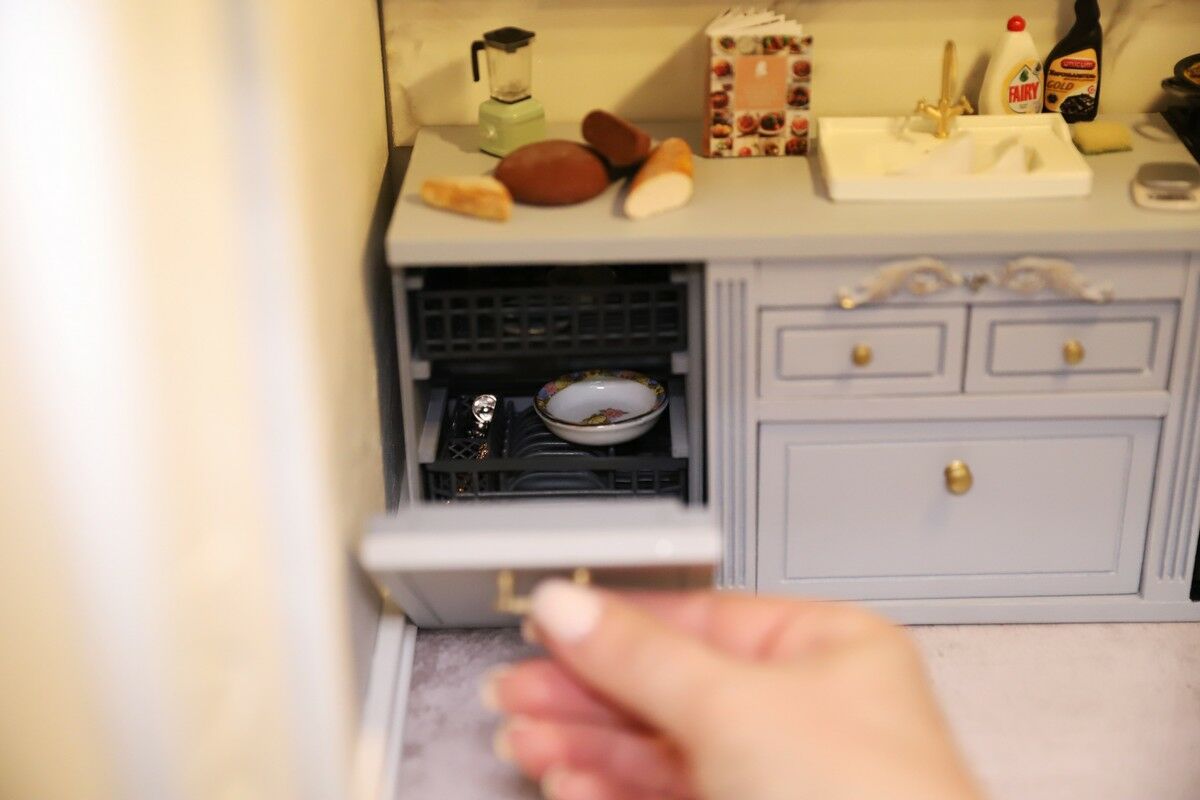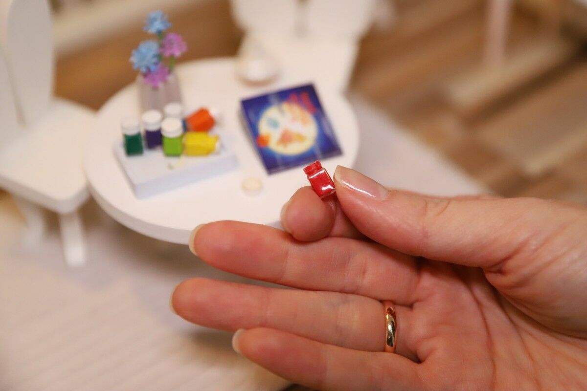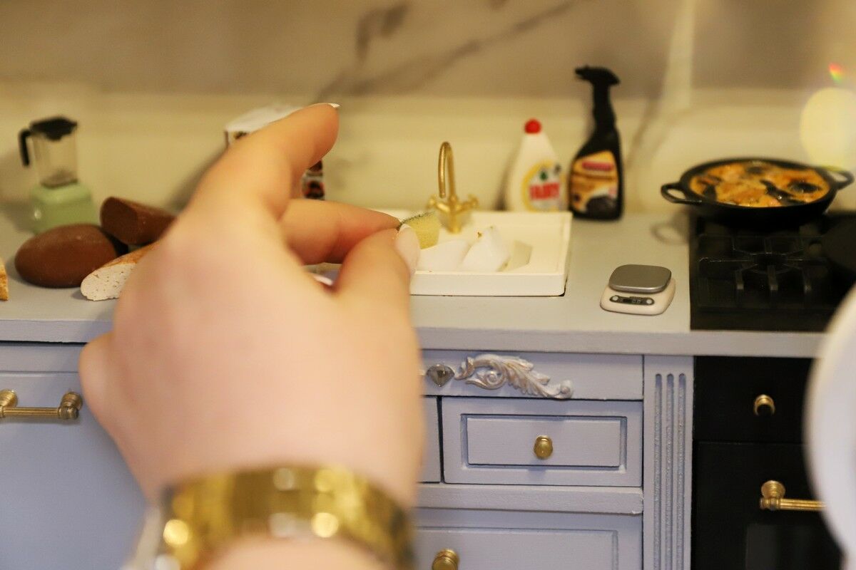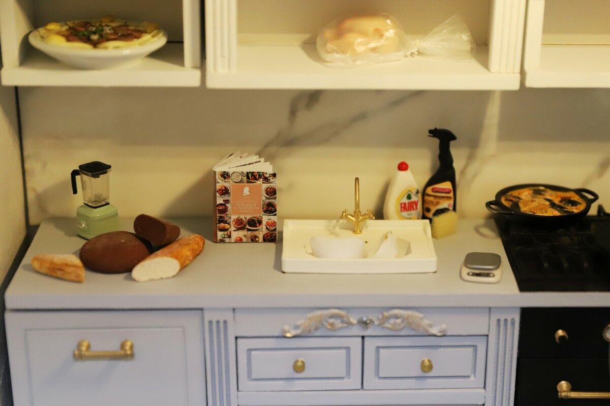 Крошечные выключатели на стенах позволяют выбирать разные сценарии освещения для разных комнат - над хитроумной проводкой поработал Муслим. В мойке - несколько тарелок, которые можно вымыть крошечной губкой. Пористый хлеб режется канцелярским ножом. На столике для творчества - остро заточенные карандаши, в малюсеньких тюбиках - настоящие краски. А наверху сейф с мини-купюрами…