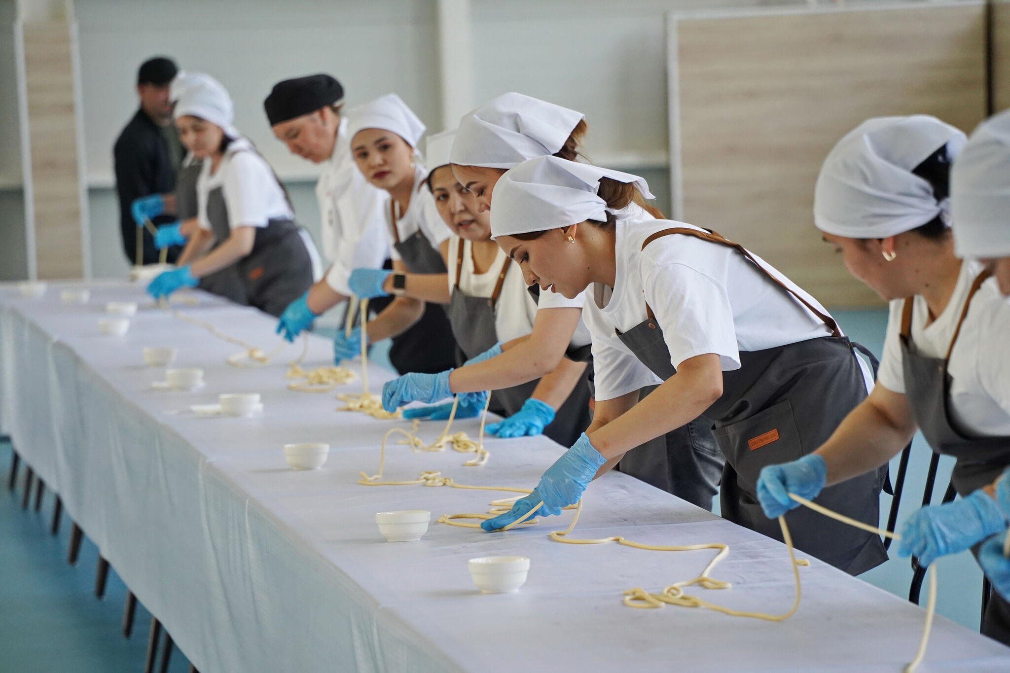 Районный акимат предоставил для готовки зал спортивного комплекса. Тесто приготовили за несколько часов до установки рекорда - чтобы оно стало пластичным, послушным, ему нужно отлежаться. Навели стерильность, установили столы. Хозяйки смачивают руки маслом и тянут, тянут.