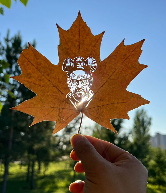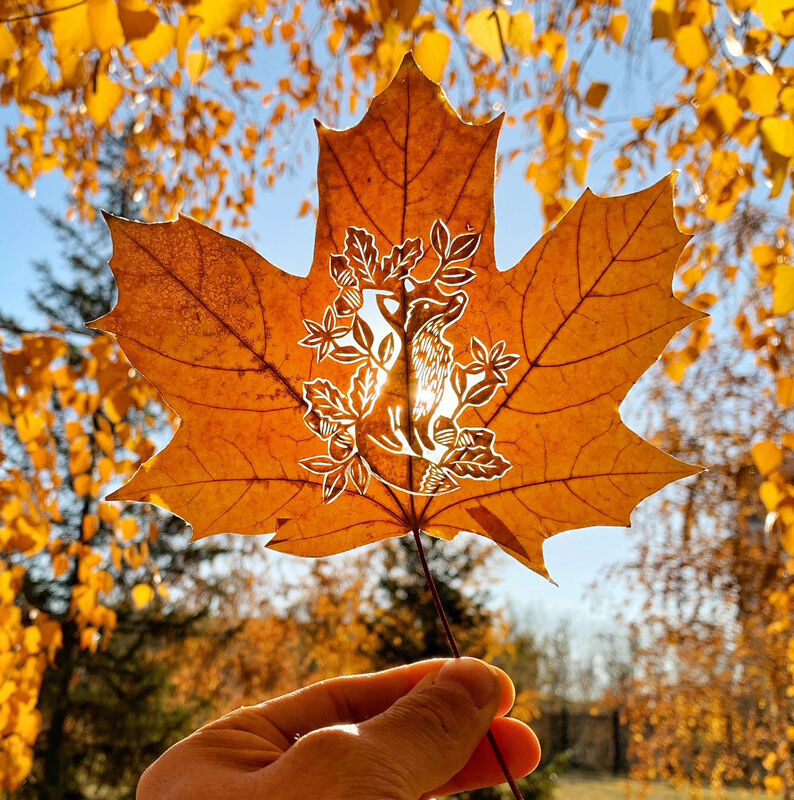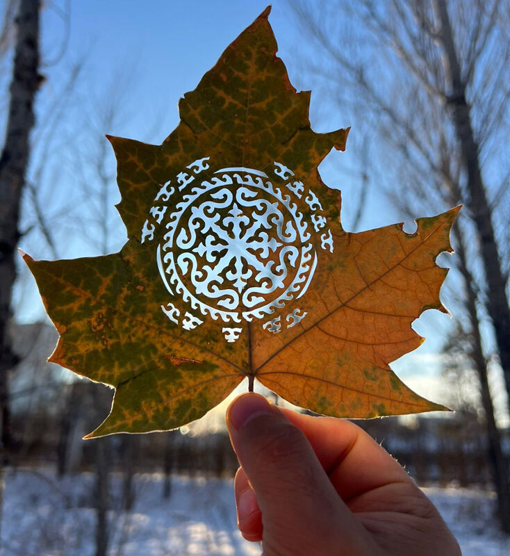 На прогулку он ходит обязательно с ежедневником, в который складывает самые красивые, вдохновляющие листья. Дома эти заготовки можно достать, пропитать глицерином, чтобы вернуть цвет и пластичность, затем приклеить к бумаге, нанести рисунок и сделать ювелирные прорези канцелярским ножиком. Таких работ у Каната уже более 500!