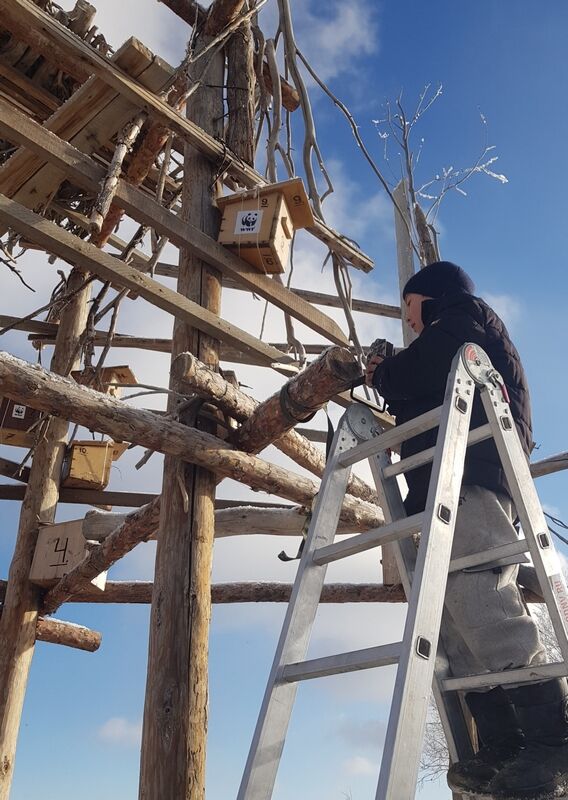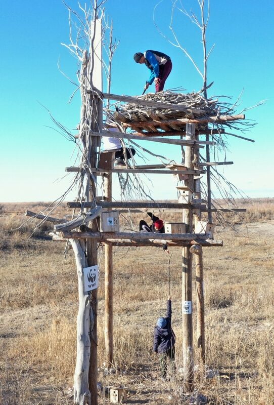 Еще один крутой проект - искусственное гнездо для краснокнижного орлана-белохвоста. Это, конечно, уже заслуга самого Алтая Жатканбаева. Но происходило все на глазах у детей. Орнитолог долго наблюдал одну пару, ставил фотоловушки. Птицы занимают чужие прошлогодние гнезда. А тут беда - сухую турангу, где квартировала наблюдаемая пара, повалил шквальный ветер. Строить новое жилище негде, деревьев там немного. А сняться с насиженных мест не в привычках орланов - птицы придерживаются территориальности.