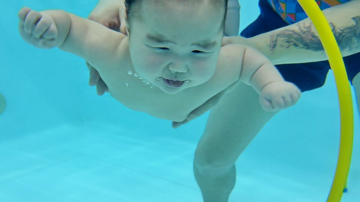 Будущему мастеру спорта надевают специальный подгузник - мало ли какой конфуз случится - и запускают в бассейн. То, что должны уметь делать эти маленькие пловцы, на самом деле не каждый взрослый умеет: нырять и доставать со дна предметы, плыть по тоннелю, правильно пускать пузыри. Но несмотря на зашкаливающий уровень умиления, это серьезный вид спорта.