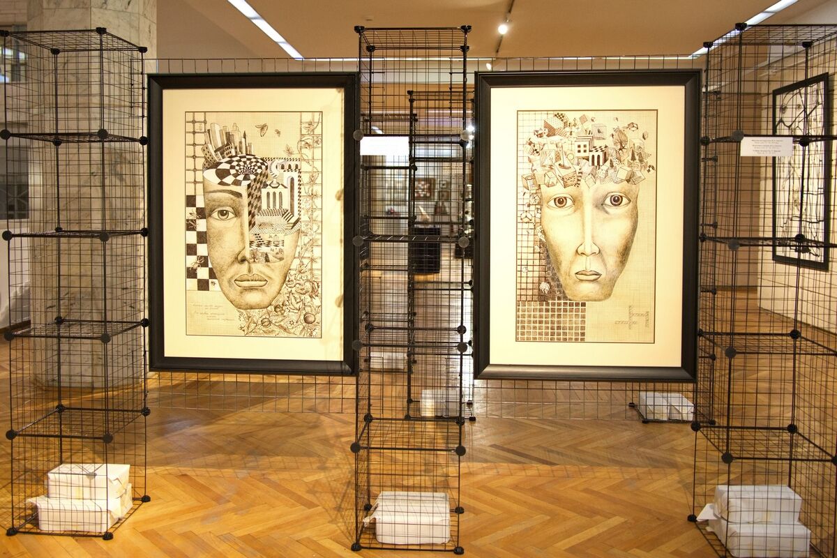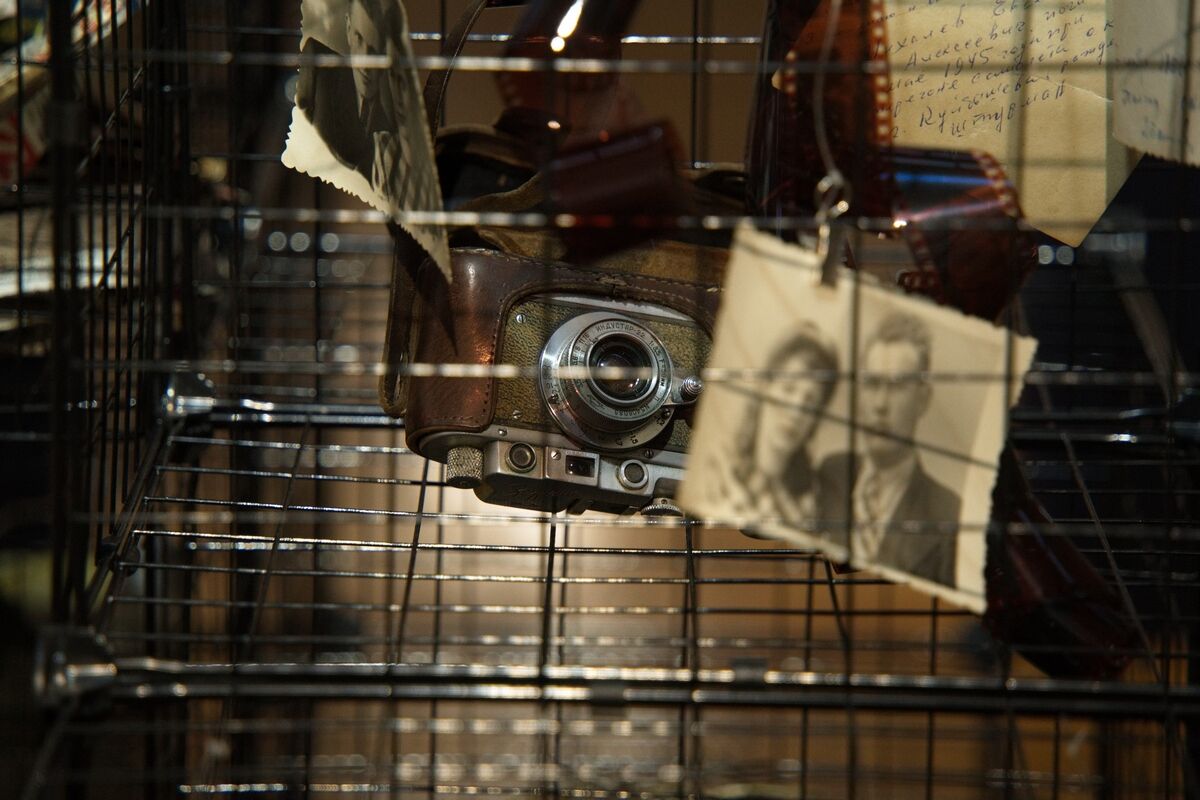 Часть работ чинно висит на стенах, часть смотрит на посетителей из витрин, но некоторые заключены в натуральные клетки. В центре зала и вовсе конструкция из составленных многоэтажкой клеток, внутри каждой находятся предметы: старый фотоаппарат и фотографии, ворон и ветки, деньги, бумажки, предметы быта. Все это еще и замысловато связано между собой, похоже на огромный ребус.