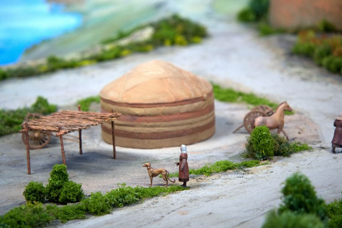 На стендах удивительные артефакты: колчан из бересты, лоскут полуистлевшего шелка, по которому специалисты восстановили костюм представителя знати династии чагатаидов. Традиционная диорама средневекового города соседствует с виртуальной витриной, на которой можно «полистать» находки археологов и с помощью сенсорного экрана рассмотреть со всех сторон.