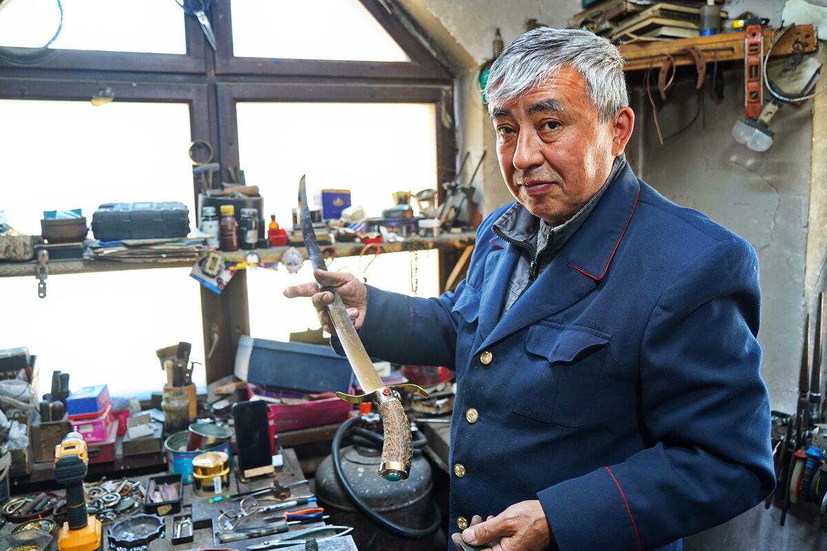 Всё оказалось просто: Шебер-аула как такового больше нет. В посёлке жизнь идёт своим чередом, а на пригорке рядом мы действительно нашли несколько мастерских. В первой, крохотной, стены увешаны лекалами странных форм, кусками кожи и уздечками - здесь царство Серикказы НУРГАЛИЕВА и Жанибека МУКАЖАНОВА. Первый - потомственный изготовитель конских сёдел, знает всё о региональных особенностях этого дела, так что его не раз привлекали к работе в кино, где нужна была предельная историческая достоверность. Где седло, там и работа с металлом, так что рядом трудится коллега Жанибек - ювелир и оружейник.