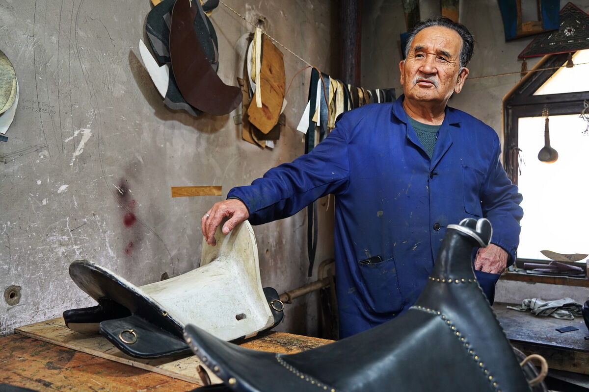 Серикказы исполнился 71 год. Он со смехом говорит, что настоящие мастера не выходят на пенсию, не могут сидеть без работы. Для нас из подсобки достаёт почти готовые сёдла - не помпезные, но очень любовно сделанные. На стене висят старые уздечки, которые принесли для починки. Разговор идёт под неторопливую работу.