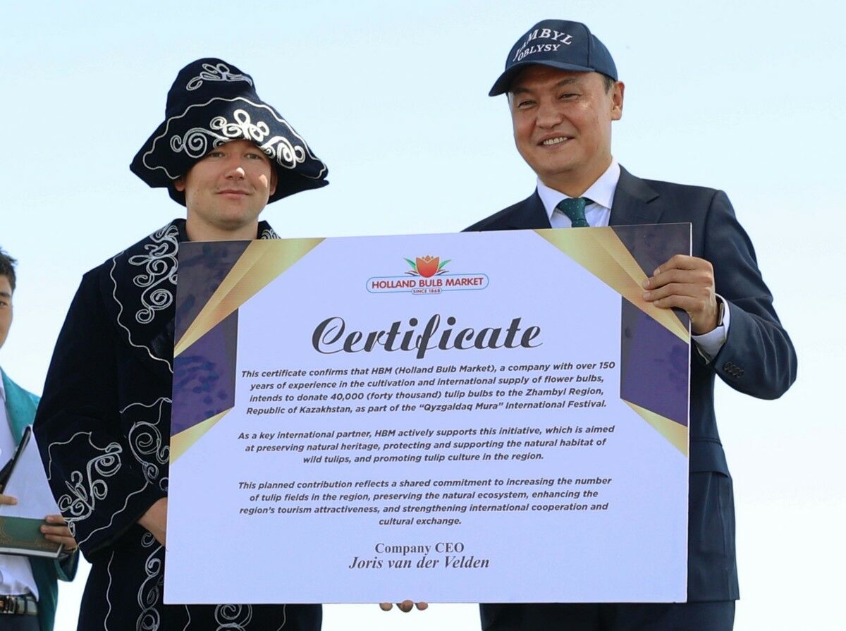 Главным участником фестиваля была цветущая степь. А ключевым событием стала передача Жамбылской области 40 тысяч луковиц тюльпанов от Королевства Нидерландов - страны, с которой эти цветы традиционно ассоциируются во всём мире. Подарок вручил менеджер компании Holland Bulb Market Марсели ПЬЕХНА. Этот жест - и знак сотрудничества, и своеобразный мост между европейской и казахстанской культурами.