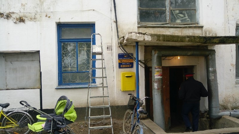 Отделение “Казпочты” располагается в двухэтажном доме, где находятся также жилые квартиры, медучреждение и опорный пункт полиции на первом этаже.
