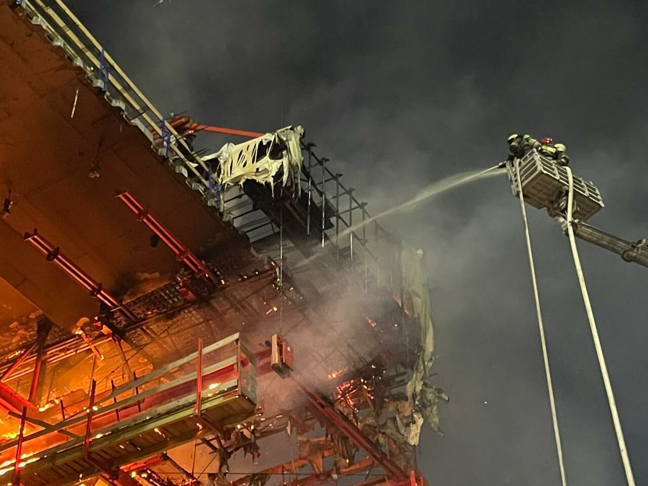 Огонь охватил всё ту же четвёртую опору, которую пожарные уже тушили в конце января. Но если тогда площадь возгорания составляла 60 квадратных метров, то сейчас — 160. Как и в прошлый раз, на высоте 30 метров над землёй горели утеплитель и деревянные элементы опалубки.
