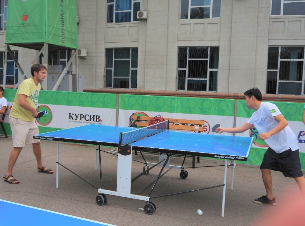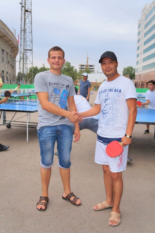 Встреча проходила под открытым небом и собрала более трех десятков любителей тенниса. За каждым столом кипели нешуточные страсти. Но особо жаркой и интригующей получилась финальная игра между известным блогером Александром ЦОЕМ (на снимке - слева) и кандидатом в мастера спорта по настольному теннису Аханом БИЯТОВЫМ (на снимке - справа).