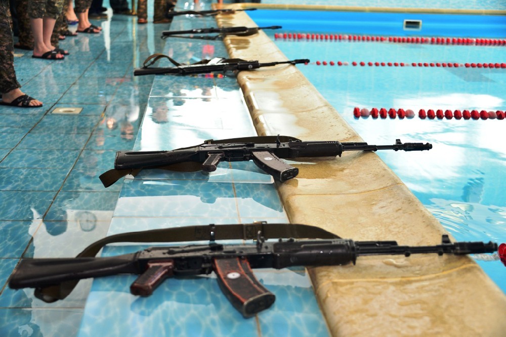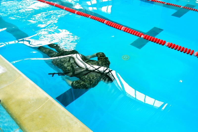 Один из самых сложных этапов - ныряние на дальность. Участникам нужно было как можно дальше проплыть под водой с автоматом АК-47 на плече.