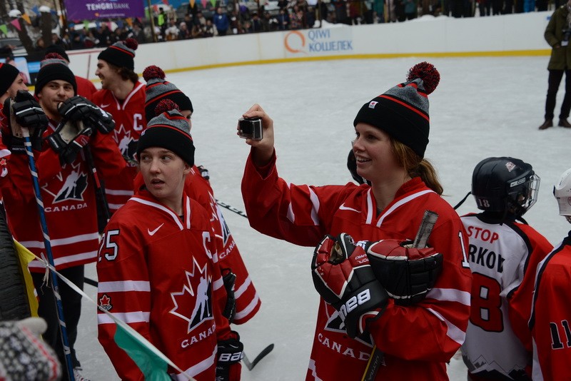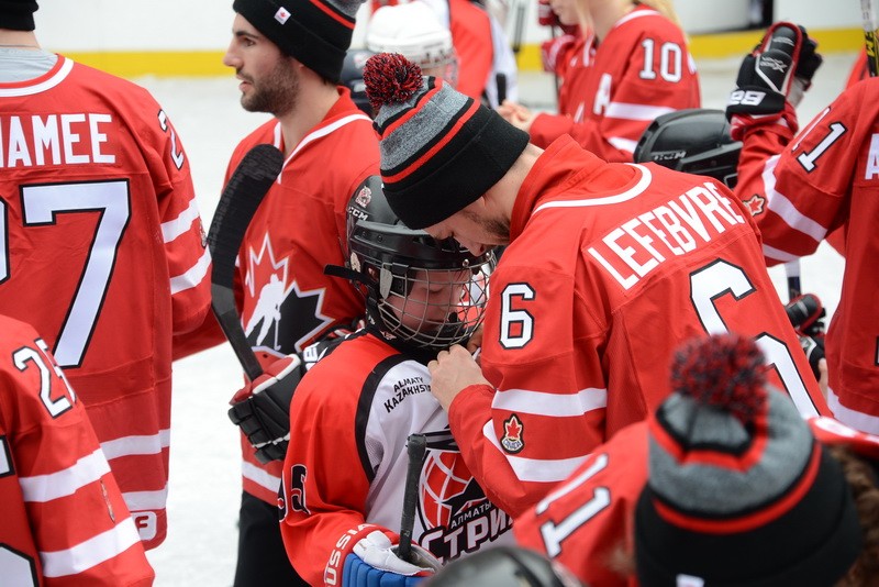 Начинающие алматинские спортсмены внимательно наблюдали за работой канадцев на льду. Но наши ребята тоже не лыком шиты: когда они вышли на дружеский матч, то показали на что способны и даже забили пару шайб.