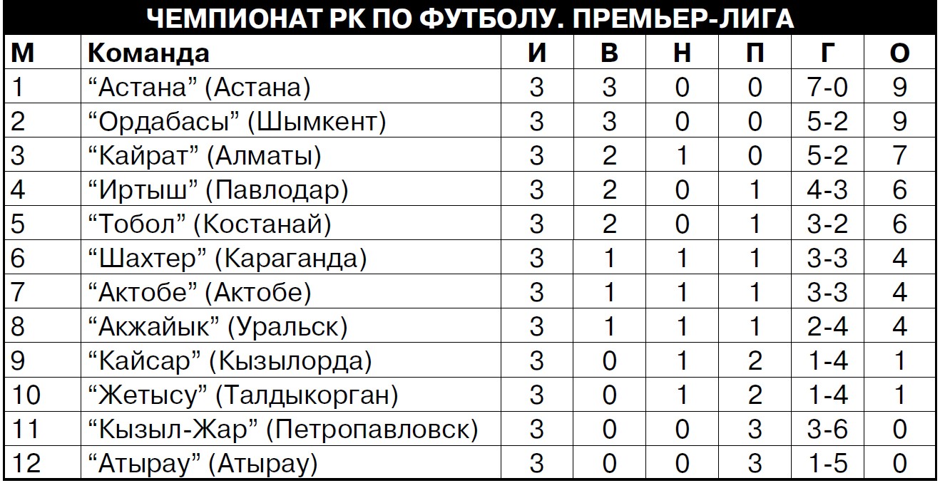 Без потерь в чемпионате идет и “Ордабасы”. Шымкентцы в гостях одолели “Атырау” - 1:0. Первое поражение потерпел “Иртыш”. Павлодарцы уступили в Уральске “Акжайыку” - 0:1. Третий раз проиграл петропавловский “Кызыл-Жар СК”. На этот раз дома костанайскому “Тоболу” - 1:2. Не смог выиграть в Астане карагандинский “Шахтер”, хотя ему противостоял совсем не чемпион, а всего лишь талдыкорганский “Жетысу” - 1:1.