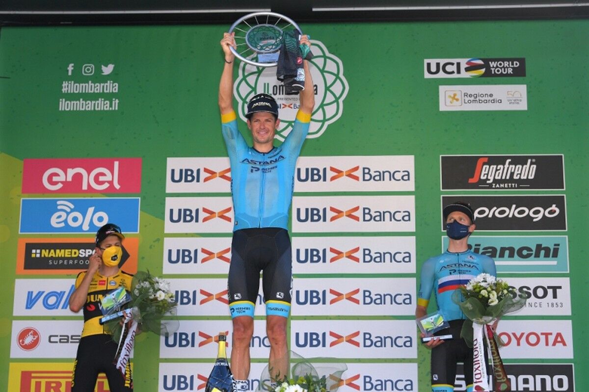 На монументальной классической итальянской гонке “Тур Ломбардии” отличились сразу два гонщика “Астана Про Тим” - Якоб ФУЛЬСАНГ и Александр ВЛАСОВ. Датчанин стал победителем, а россиянин занял третье место. Между ними протиснулся новозеландец Джордж БЕННЕТ из Jumbo-Visma. Втроем они убежали от всех преследователей и разыграли подиум.
