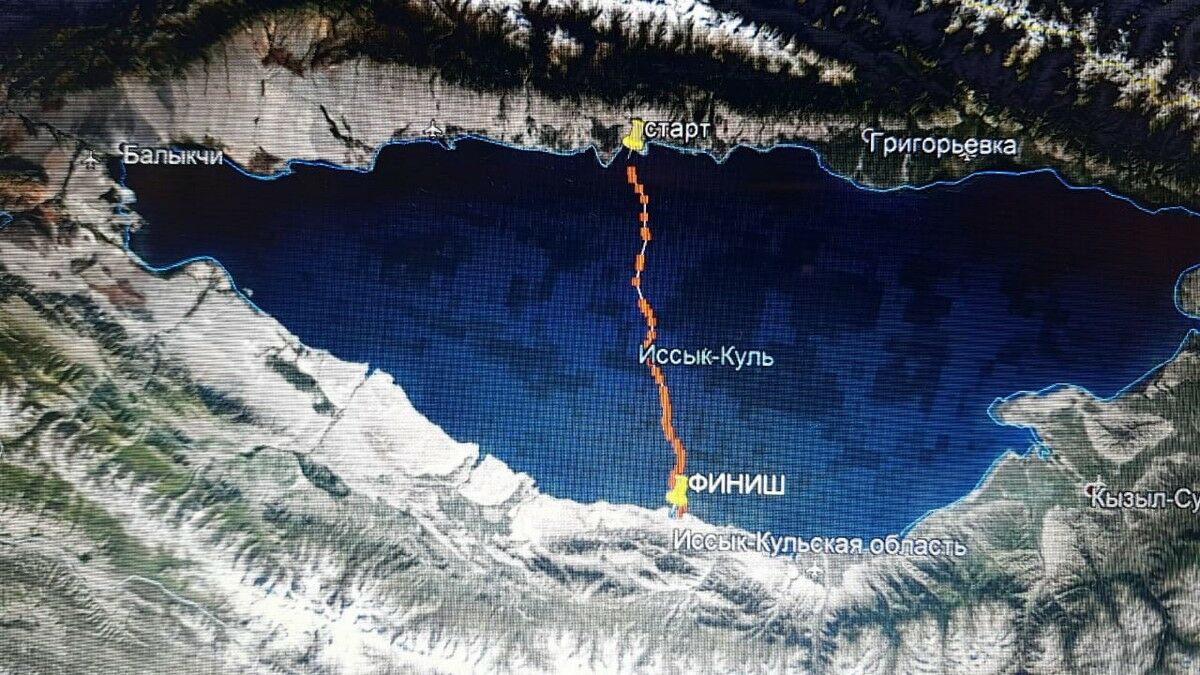Виталий Худяков: Я часто здесь тренируюсь. Ну и как-то задумался: а кто-нибудь вообще переплывал Иссык-Куль? Оказывается, в 1982 году это сделал известный киргизский пловец Ахмед АНАРБАЕВ. Но он преодолел дистанцию 36 километров, потратив на это 11 часов. Вторая его попытка в 1985-м оказалась неудачной. Он хотел переплыть Иссык-Куль в самом широком месте. И я выбрал дистанцию, которую здесь никто не преодолевал. Решил проверить себя, свои силы и возможности.
