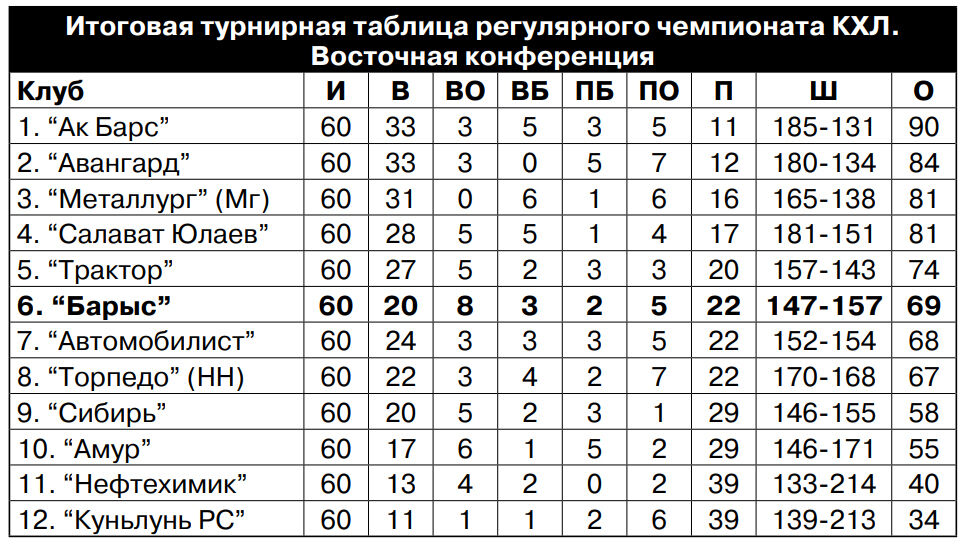 Правда, судя по результатам последних матчей, создается такое ощущение, что многим было все равно, кто будет их противником. Все шесть команд независимо от занятых мест примерно одного класса. Может, поэтому никто особо и не рвался занять место чуть выше. Пожалуй, только “Авангард” хотел занять вторую строчку на Востоке, чтобы выиграть дивизион Чернышева. Ну и тренер омичей Боб ХАРТЛИ не скрывал, что не горел желанием играть в плей-офф с “Барысом”.