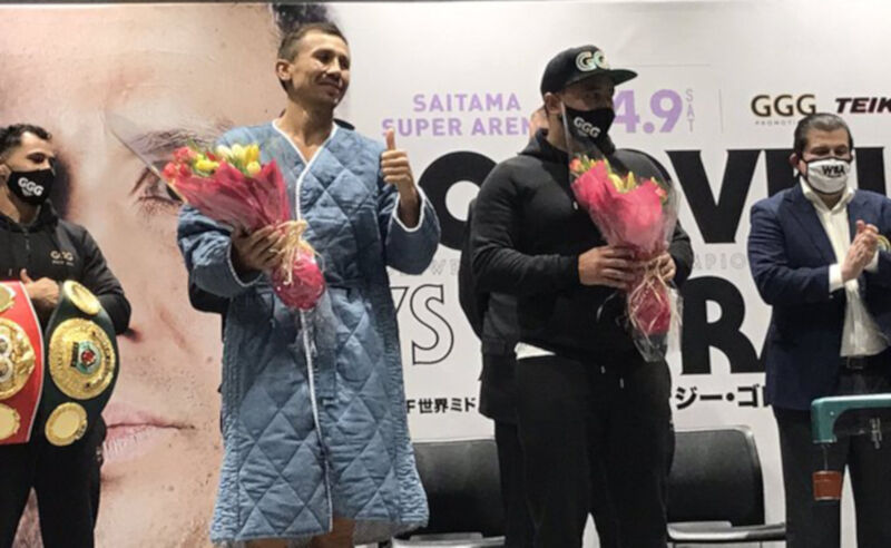 Соперники сразятся за чемпионские титулы IBF, IBO и WBA Super. По результатам взвешивания оба боксера уложились в лимит средней весовой категории (до 72,5 кг, или 160 фунтов), показав на весах по 72,5 килограмма. Интересно, что в день церемонии взвешивания Головкину исполнилось 40 лет. И приятно, что организаторы мероприятия не забыли о знаменательной для GGG дате. Геннадию и его брату-близнецу Максиму под аплодисменты всех собравшихся вручили праздничные букеты цветов. Воспитанный GGG поблагодарил всех на четырех (!) языках: японском, английском, русском и казахском.