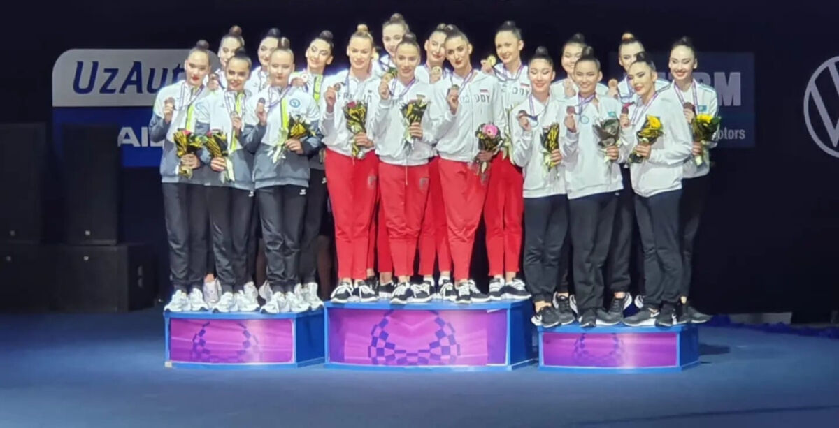 Сначала наша команда добыла бронзу в многоборье в групповых упражнениях. Золото у Болгарии, а серебро у Узбекистана. На следующий день, когда разыгрывались места в отдельных видах, казахстанские “художницы” взяли бронзовую медаль в состязаниях с обручем и серебро в упражнении с мячом и лентой.