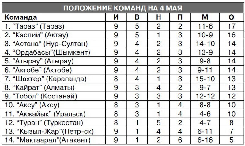 Недавний лидер чемпионата “Каспий”, порой демонстрирующий самый яркий футбол, ухитрился проиграть в гостях дебютанту Премьер-лиги “Аксу” из Павлодарской области - 0:2. Хотя чему тут удивляться? “Аксу”, помнится, обыграл и “Астану”.