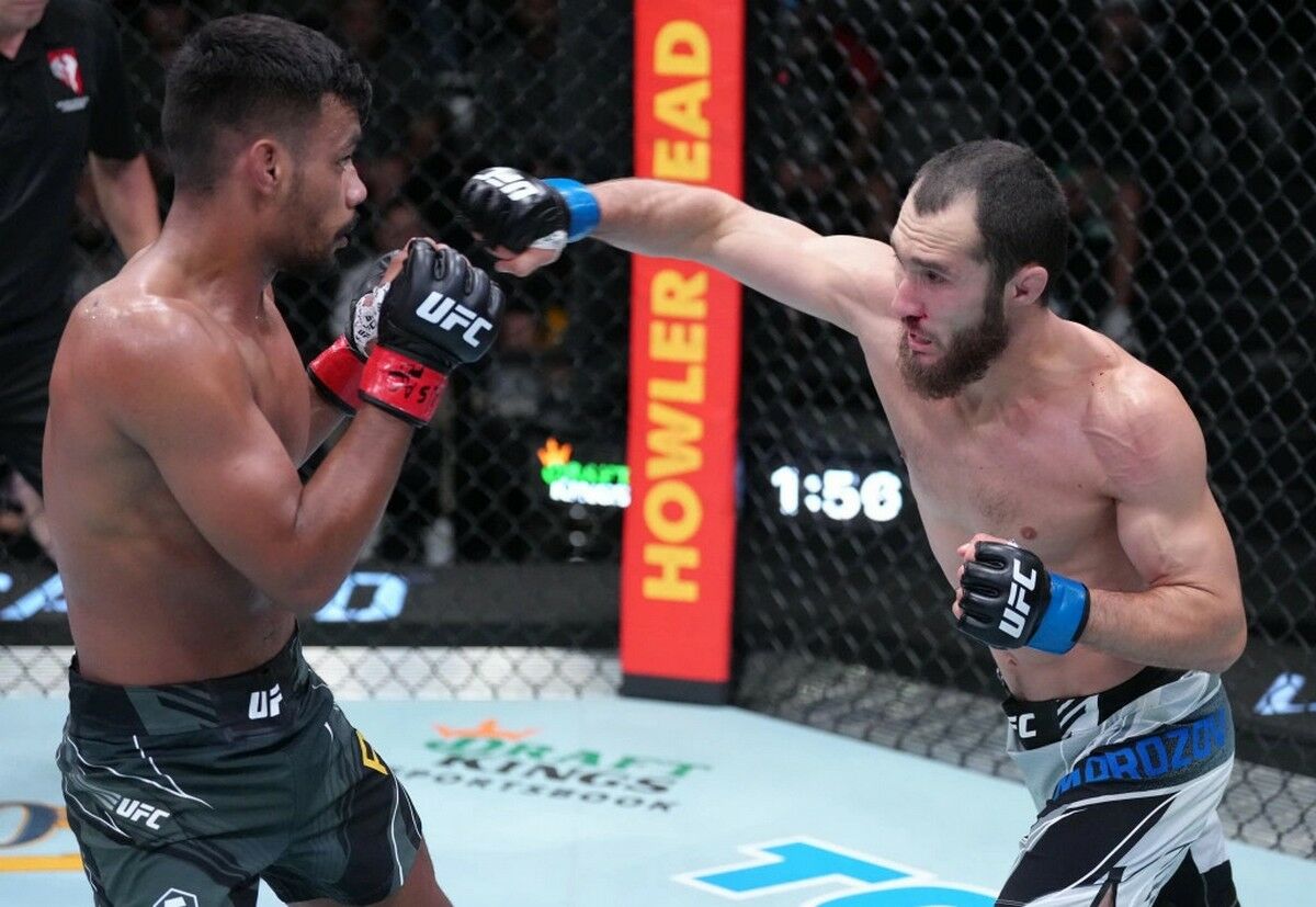 Куда труднее пришлось на этом турнире казахстанскому файтеру легчайшего веса Сергею МОРОЗОВУ. Он тоже, как и Рахмонов, проводил свой четвертый поединок под эгидой UFC. Правда, у него уже было два поражения. Соперником Сергея был обидчик нашего Жалгаса ЖУМАГУЛОВА бразилец Раулиан ПАЙВА. В первом раунде предпочтительнее выглядел южноамериканец, а два следующих забрал казахстанец. В итоге все трое арбитров отдали победу Морозову со счетом 29:28.