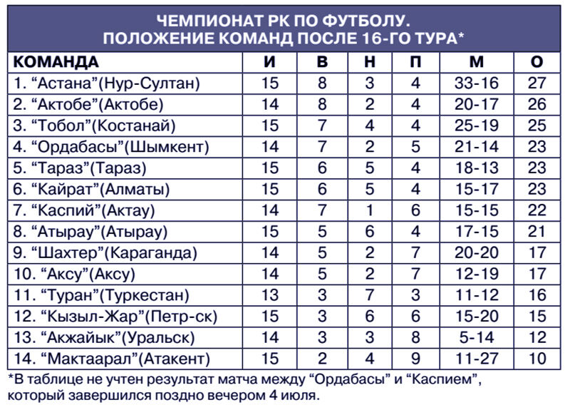Перед паузой лидерство вернула себе “Астана”, что вполне справедливо, если взглянуть хотя бы на разницу забитых и пропущенных мячей. Столичные, конечно, тоже порой чудят, но значительно меньше, чем все остальные клубы. В 16-м туре “Астана” дома разгромила “Мактаарал” - 4:0. Хотя что тут удивительного?! Команда из скромного Атакента находится на самом дне турнирной таблицы.
