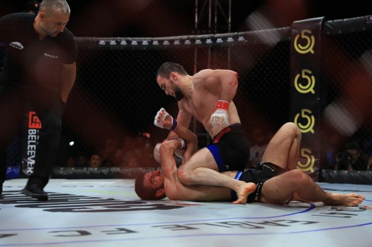 В главном поединке совместного турнира сошлись россиянин Гамзат ХИРАМАГОМЕДОВ и казахстанский спортсмен Даурен ЕРМЕКОВ. Они боролись за временный пояс EAGLE FC. Победу техническим нокаутом во втором раунде одержал казахстанский спортсмен. К слову, это 17-я победа в профессиональной карьере Даурена Ермекова.