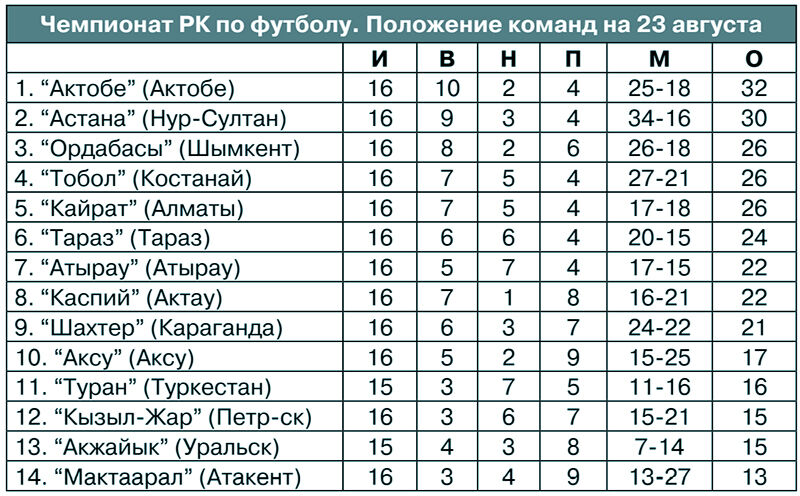 Наверное, центральным в туре был матч между первой и третьей на данный момент командами Премьер-лиги - “Актобе” и “Ордабасы”. Хозяева не могли проиграть, так как отмечали 55-летие своего клуба. Все и прошло по праздничному плану - 3:1. И “Актобе” по-прежнему единоличный лидер.