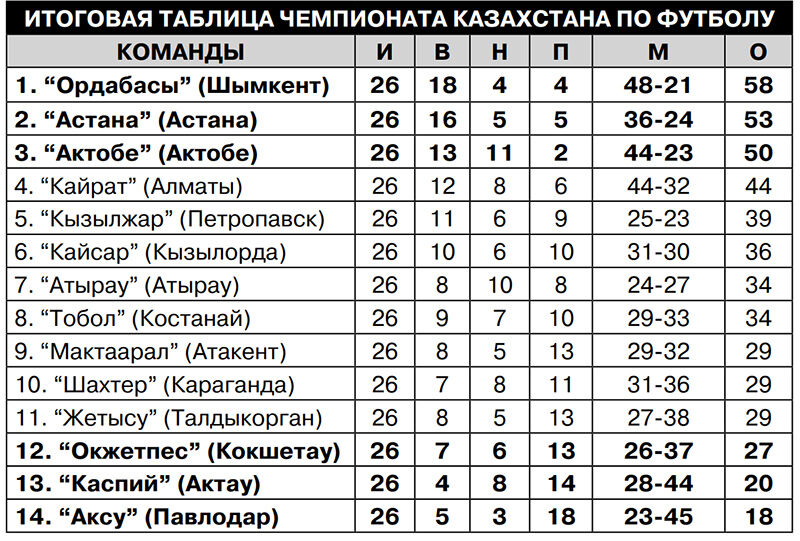 Финишировал чемпионат Казахстана по футболу. Золото досталось шымкентскому “Ордабасы”, серебро - “Астане”, а бронза - “Актобе”. Премьер-лигу покидают павлодарский “Аксу”, актауский “Каспий” и кокшетауский “Окжетпес”.