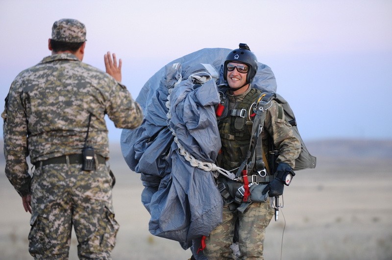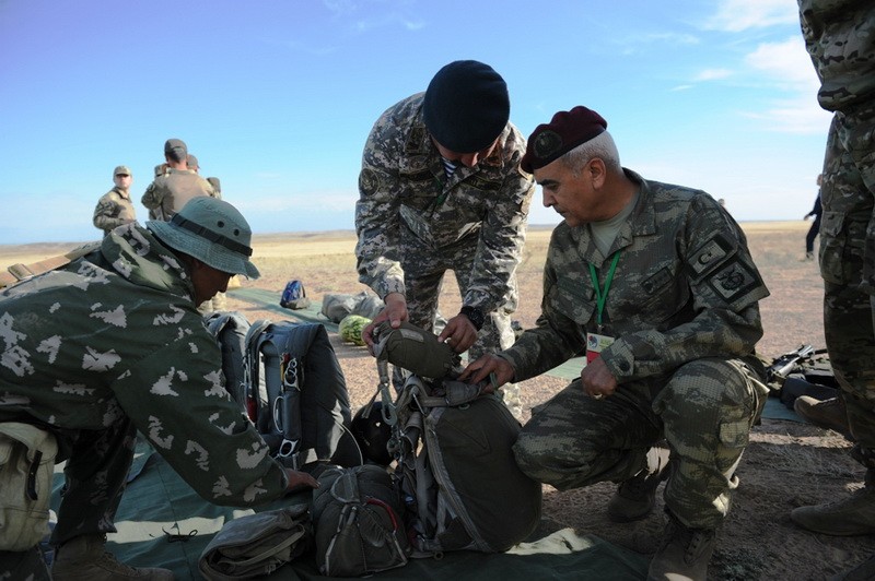 Десятисуточные учения проходили как в дневное, так и в ночное время не только на земле, но и в небе. Причем ночные прыжки с парашютом военнослужащие совершали с высоты 3000-4000 метров с задержкой раскрытия купола до 40 секунд, и дальше с помощью парашюта-крыла спецназовцы выходили в заданный район. После приземления две группы совершили 50-километровый марш-бросок со стрельбой и метанием гранат. К слову, группа под командованием казахстанского офицера из 25 мишеней ночью поразила 23, а группа во главе с турецким командиром промазала по четырем мишеням.