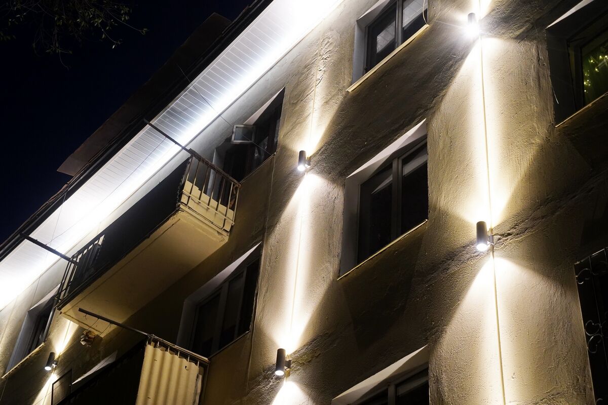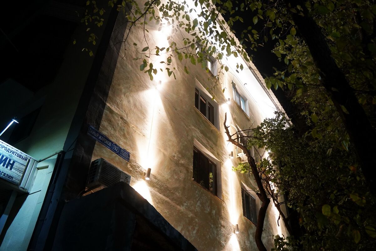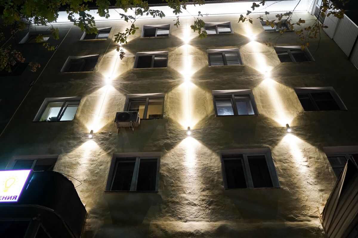 Например, празднично сверкают фасады двух старых четырехэтажных зданий и трехэтажки на пересечении улиц Жарокова и Габдуллина. Причем фонари расположены на “лице” дома несимметрично.