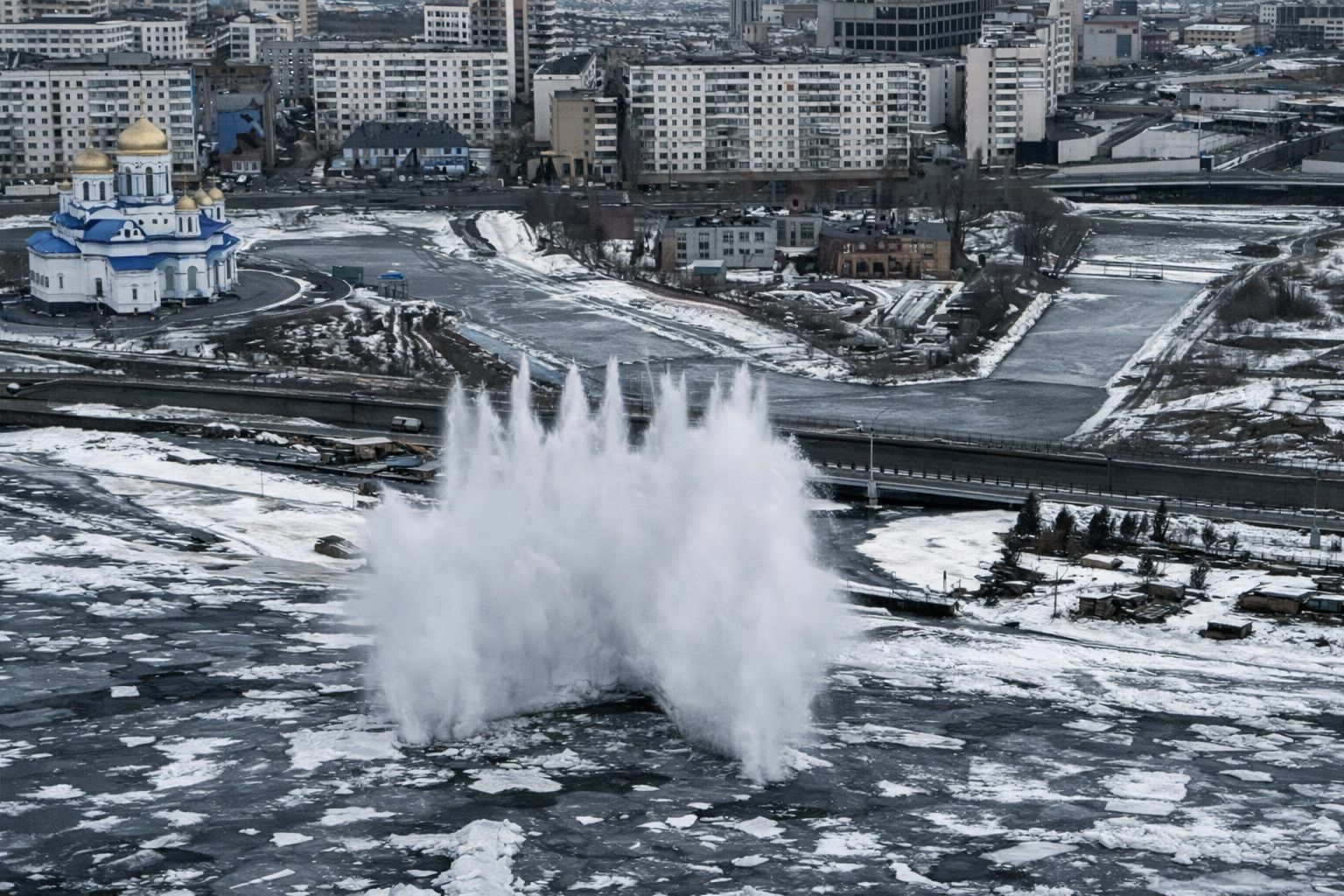 На следующий день настала очередь Петропавловска. В микрорайоне Подгора, который в 2024 году серьезно пострадал от большой воды, тоже взорвали лед.
