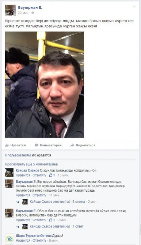 В автобусе с ветеранами Бауыржан Есмахан, он же бывший имам Актюбинской области, проехался вместе с руководителем региона Бердыбеком САПАРБАЕВЫМ. И все то время, что шеф весело общался со стариками, чиновник-теолог делал на их фоне селфи. Затем разместил фото на своей личной странице в соцсети и сделал подпись к снимку - “Быть среди народа хорошо!”. Однако тут же нарвался на критику горожан. Пользователи соцсетей, мягко говоря, пожурили чиновника за такие слова: мол, некоторые слишком быстро забывают, что сами вышли из народа.
