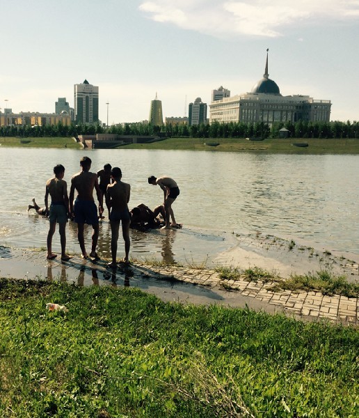 В надежде скрыться от “африканской” жары, астанчане бегут к городской воде. Недавно в центре столицы открыли совершенно новую пляжную зону, где можно плавать, загорать и - любоваться пейзажами главного президентского дворца.