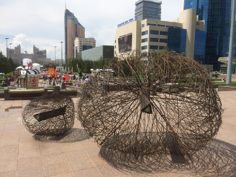 Одной из ярких уличных инсталляций стала работа известной казахстанской художницы Фатимы ОМИР под названием “Перекати-поле” (на снимке). Необычные фигуры, сделанные из металлических прутьев, по форме напоминают верблюжьи колючки, что ярко подчеркивает восточный колорит инсталляции.
