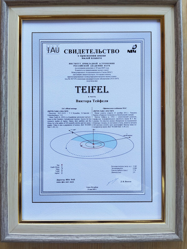 По решению Международного астрономического союза малой планете присвоено имя известного казахстанского ученого-астрофизика Виктора ТЕЙФЕЛЯ.